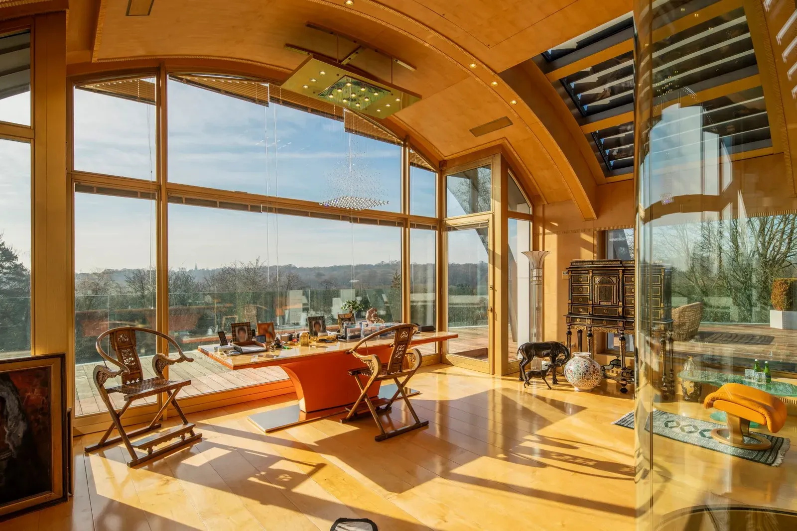 Masterful Design and Elite Comfort On the first floor, the master suite is a haven of tranquility, accompanied by four additional en-suite bedrooms. The top floor houses a magnificent home office, offering panoramic views over the gardens and the Hampstead Heath.