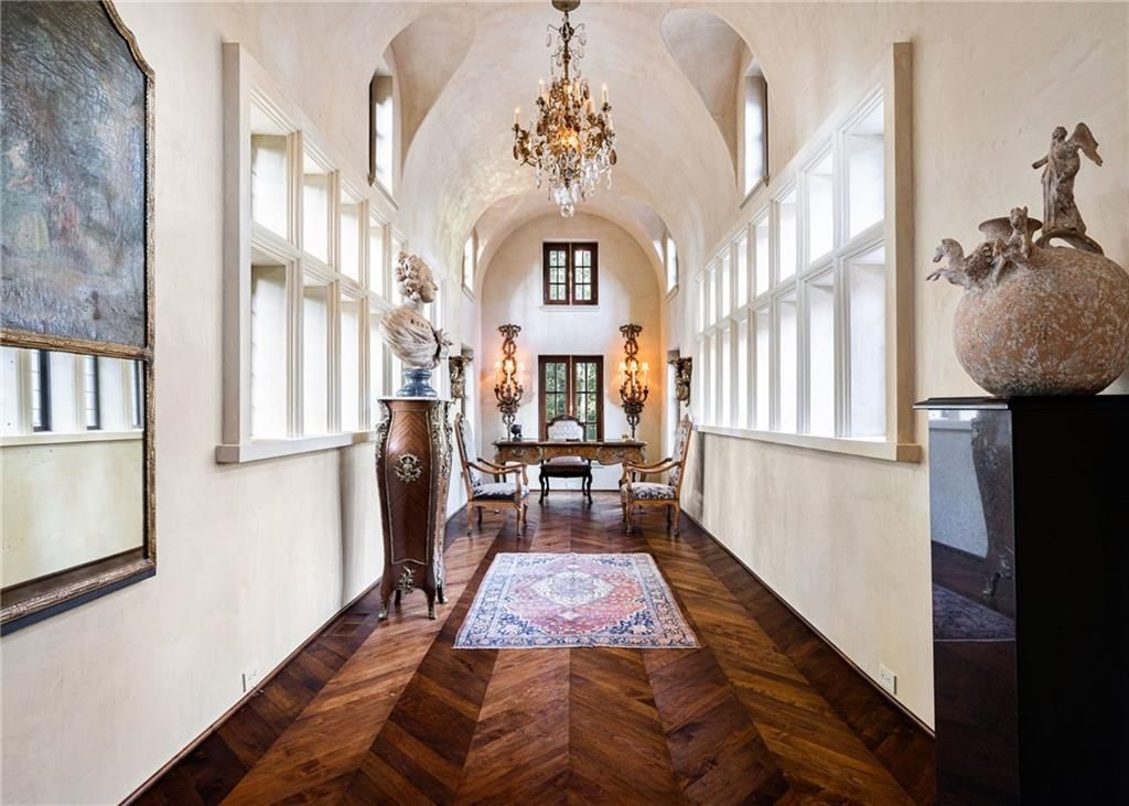• Spectacular Entry: The mansion welcomes with 19th-century Parisian double entry doors, leading to an art gallery with a 19-foot plaster ceiling inspired by the Vatican Museum.