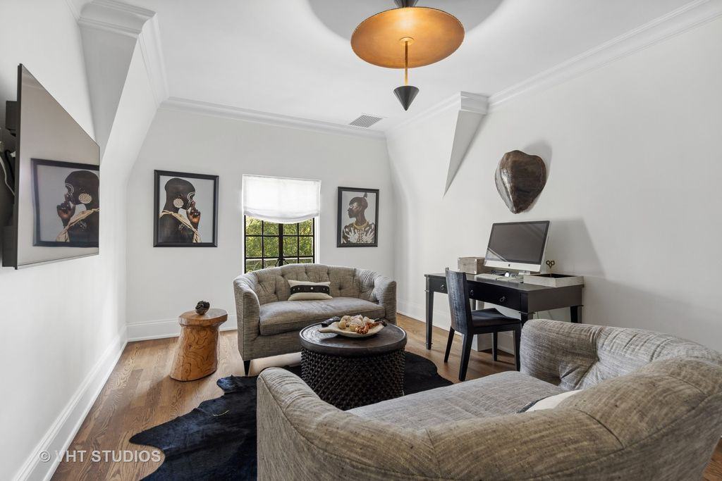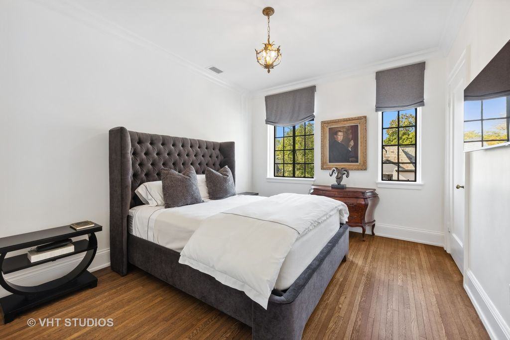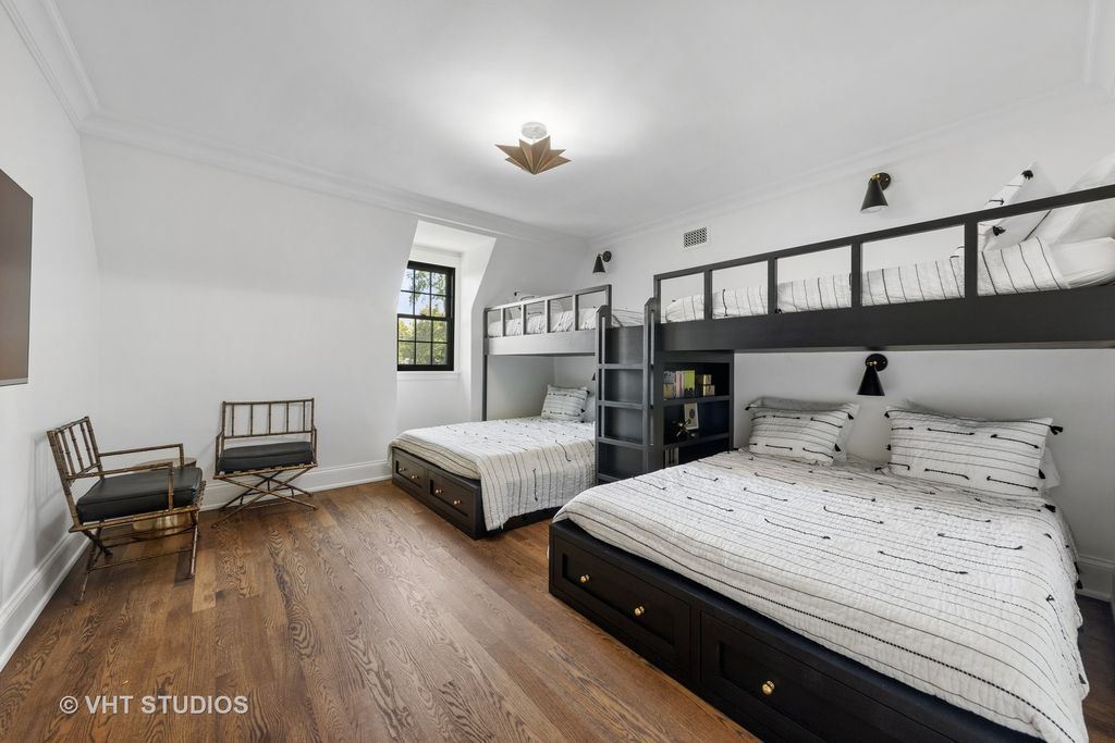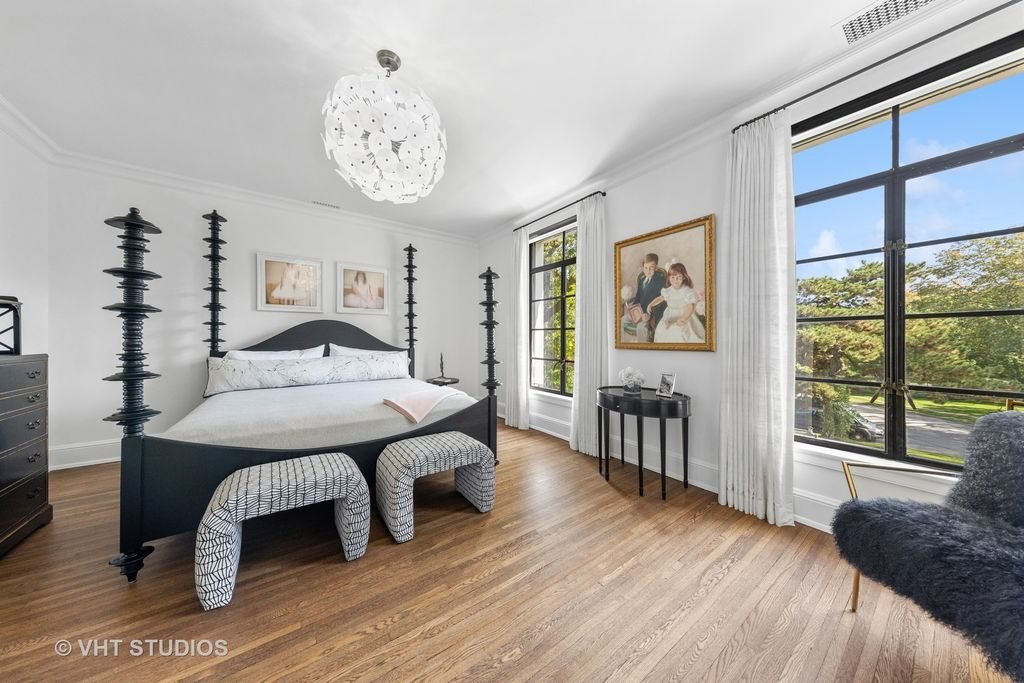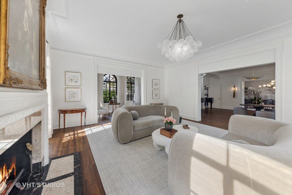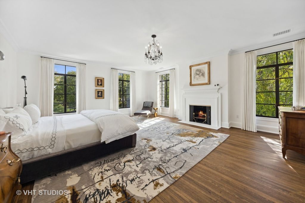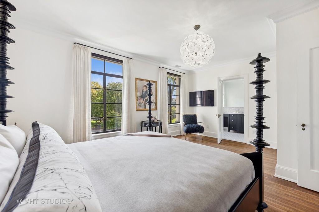 Upon entry, guests are greeted by a grand foyer boasting a 38-step, three-story curved staircase, setting the tone for the home’s elegance. The living room and library feature oversized steel French casement windows, allowing natural light to illuminate the space, while the dining room, adorned with bespoke wallpaper and a custom plaster chandelier, provides the perfect setting for entertaining. The highlight of the home is the chef’s kitchen, originally an art gallery, boasting 16′ coved ceilings, chevron floors, custom walnut cabinetry, and top-of-the-line appliances.