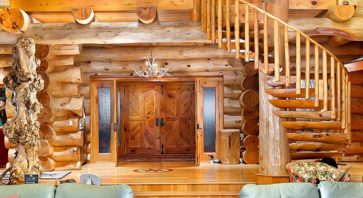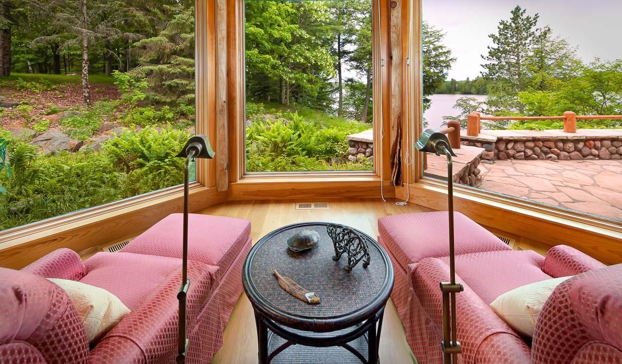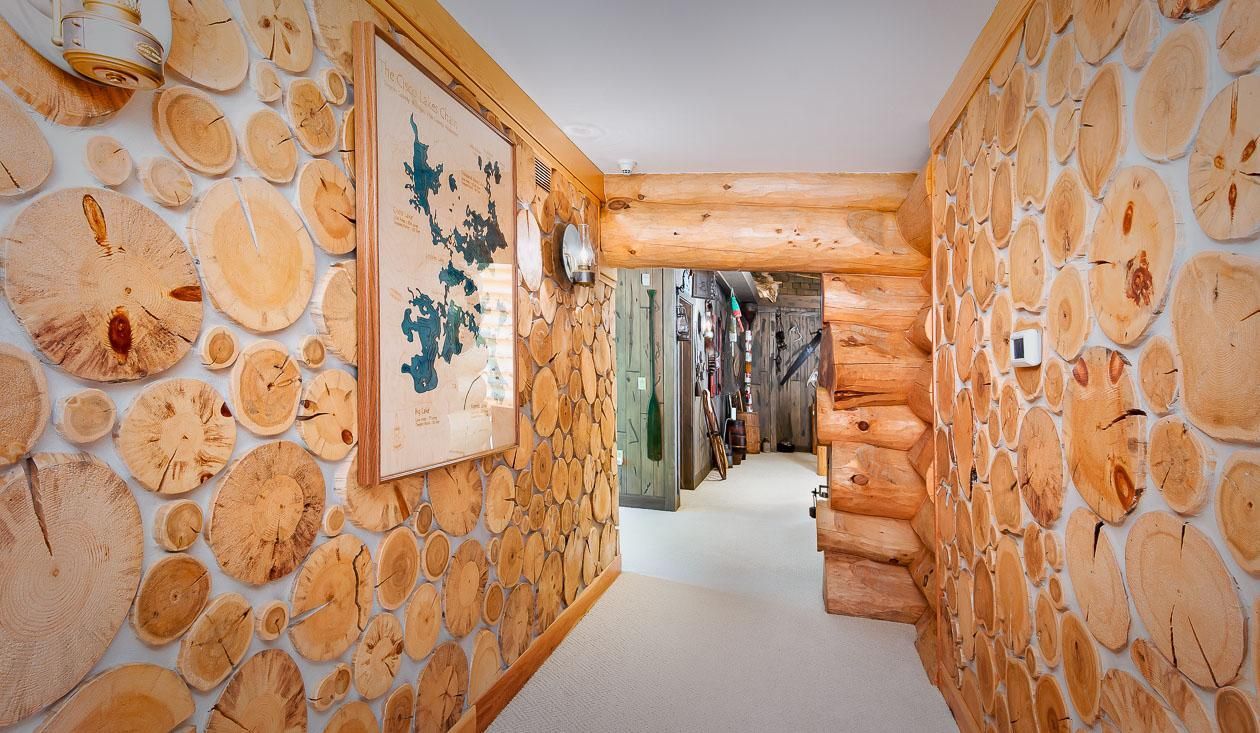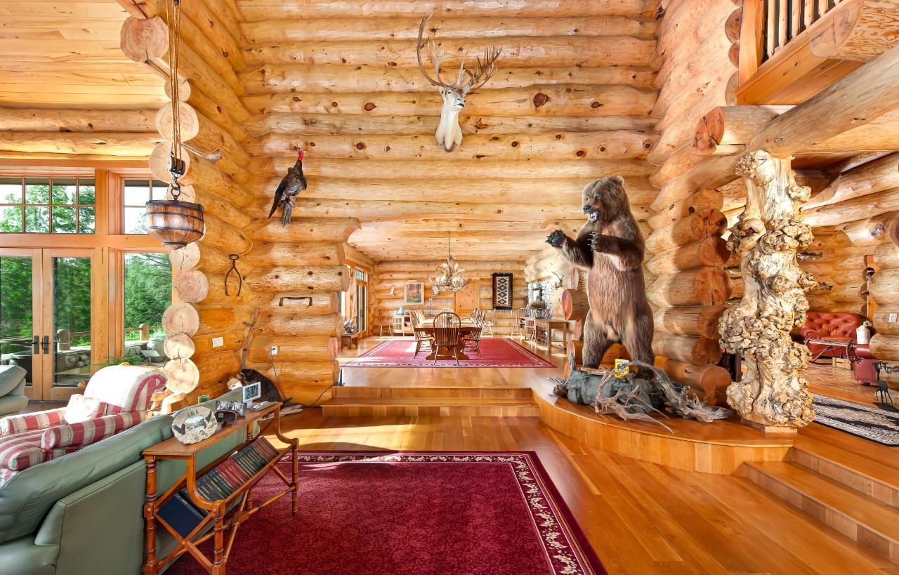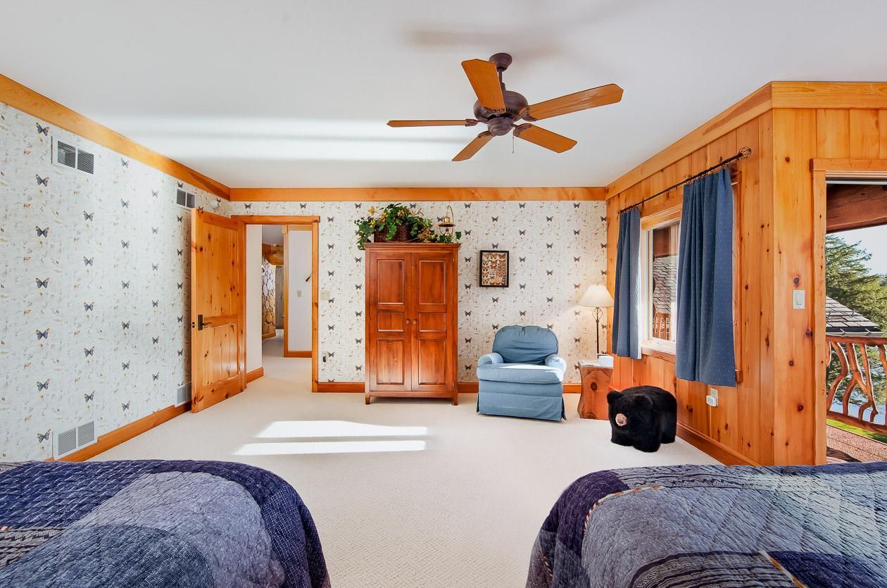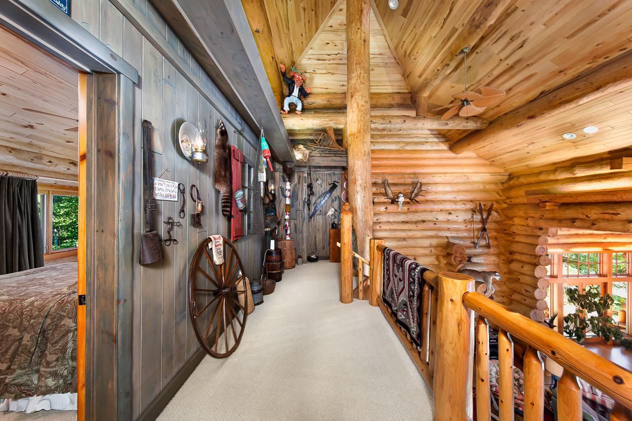 Upon arrival, guests are greeted by handcrafted double doors that open into a spectacular great room with 32-foot cathedral ceilings and a floor-to-ceiling Fieldstone wood fireplace. The wall of windows facing the lake provides breathtaking views and fills the space with natural light.