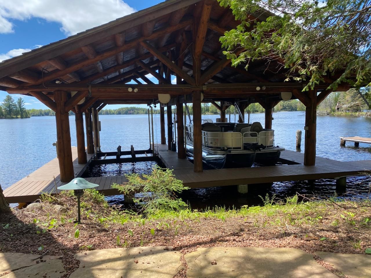 • Other outdoor amenities include a boat house, dock, and landscaping that blend seamlessly with the natural beauty of the landscape.