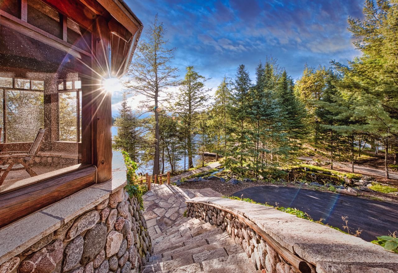 Upon arrival, guests are greeted by handcrafted double doors that open into a spectacular great room with 32-foot cathedral ceilings and a floor-to-ceiling Fieldstone wood fireplace. The wall of windows facing the lake provides breathtaking views and fills the space with natural light.