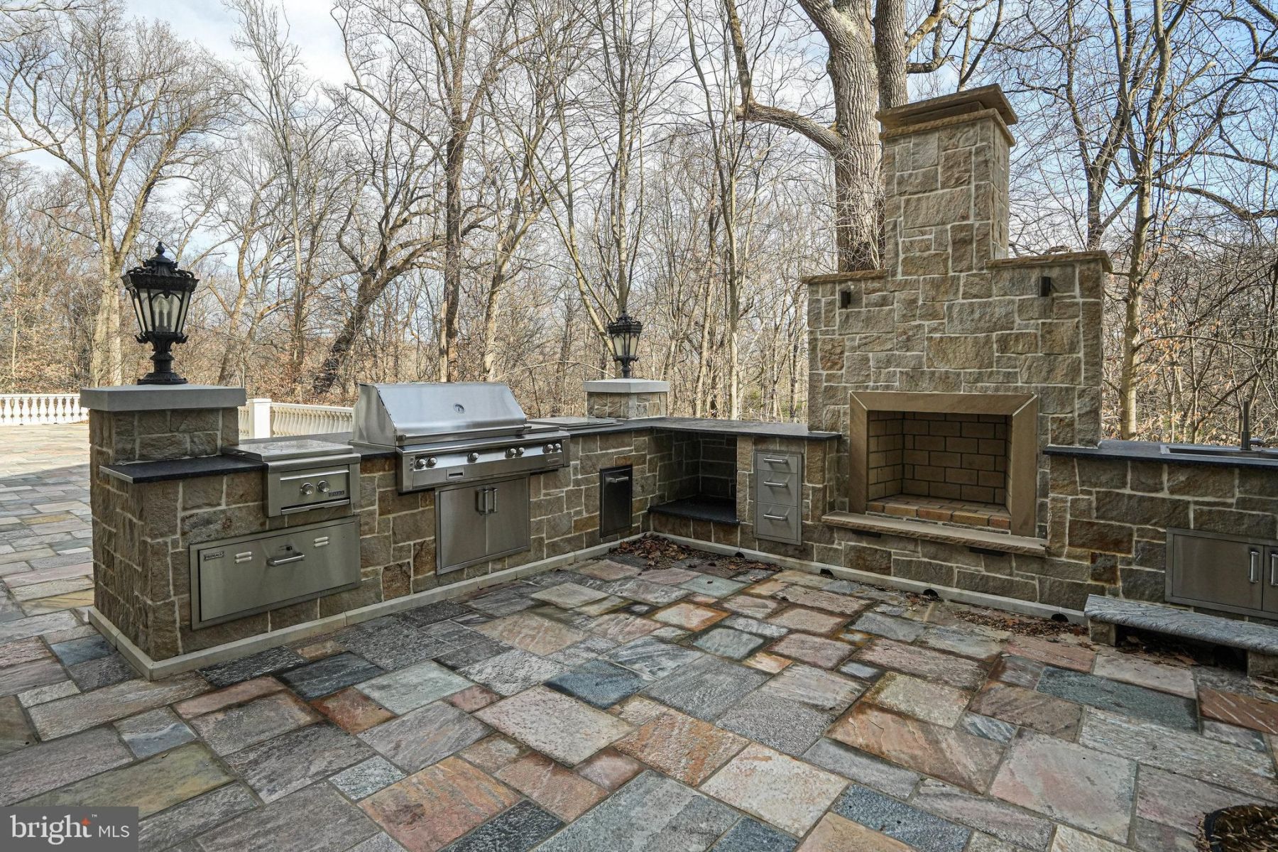 - Outdoor amenities include a terrace with a commercial-grade outdoor kitchen and fireplace, surrounded by professionally landscaped grounds.
