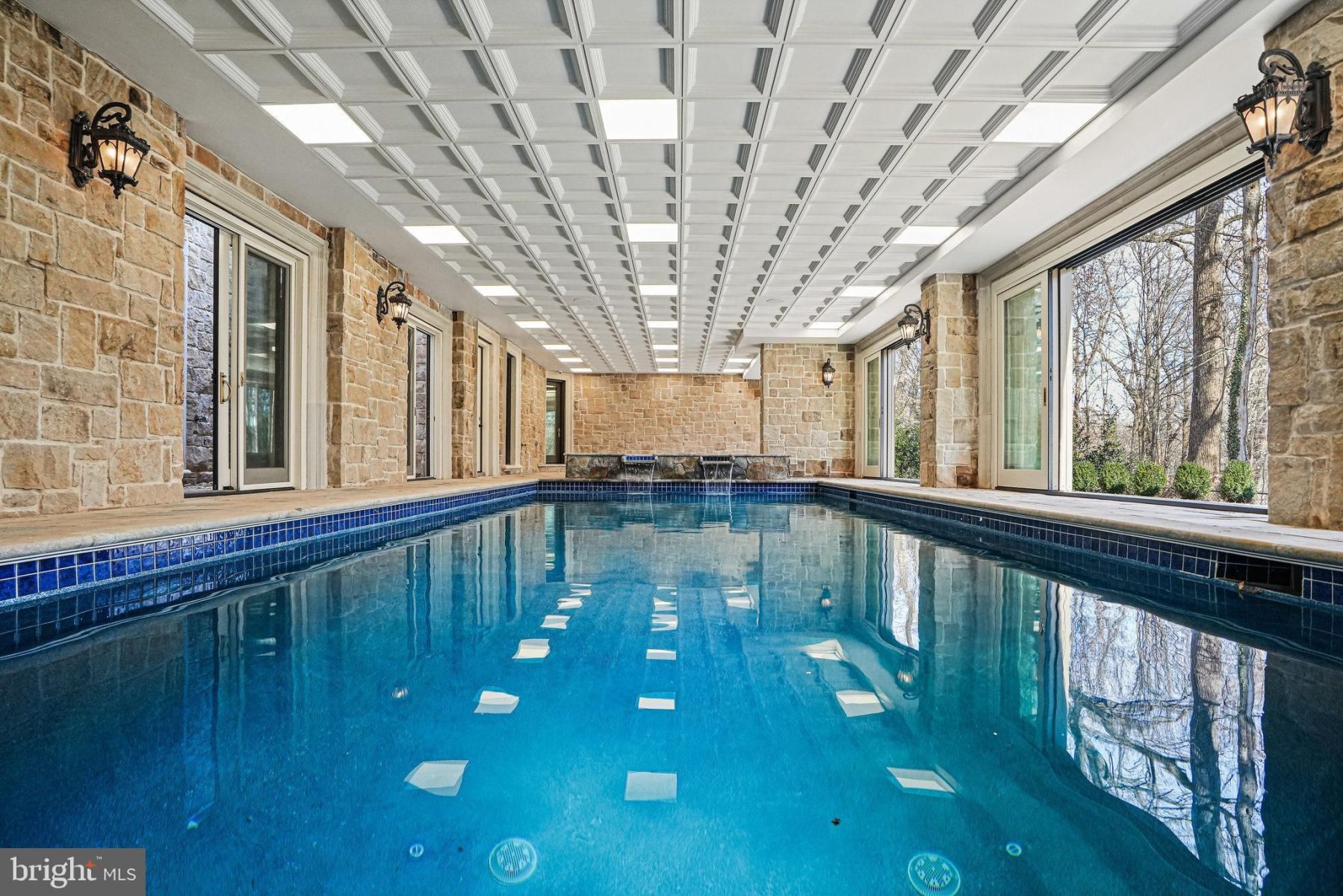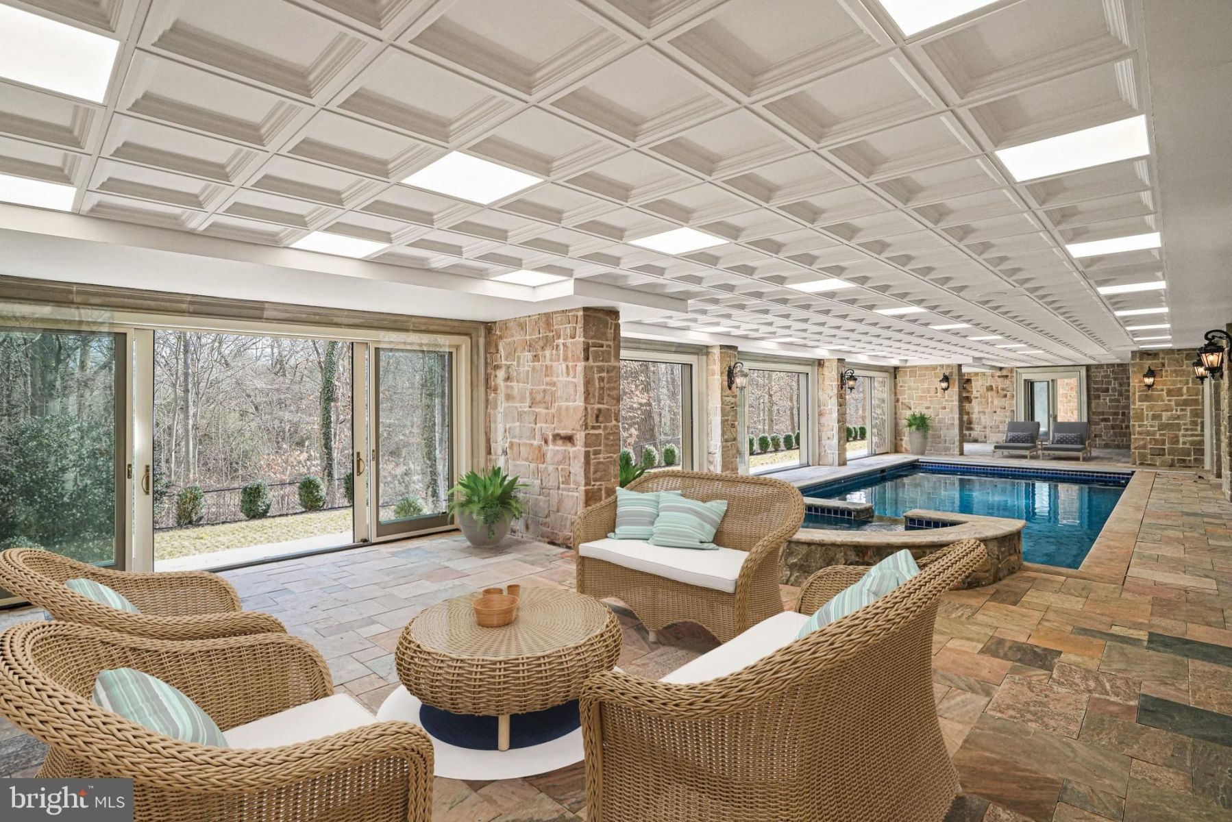 - The lower level is dedicated to entertainment and relaxation, with a spacious recreation room, home theater, and enclosed swimming pool with a hot tub spa.