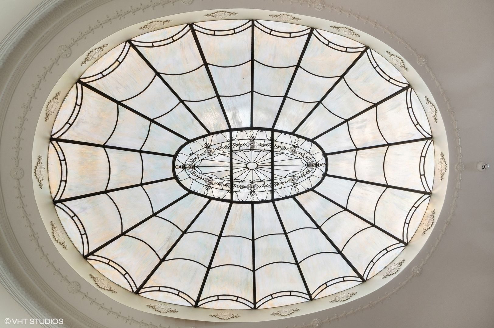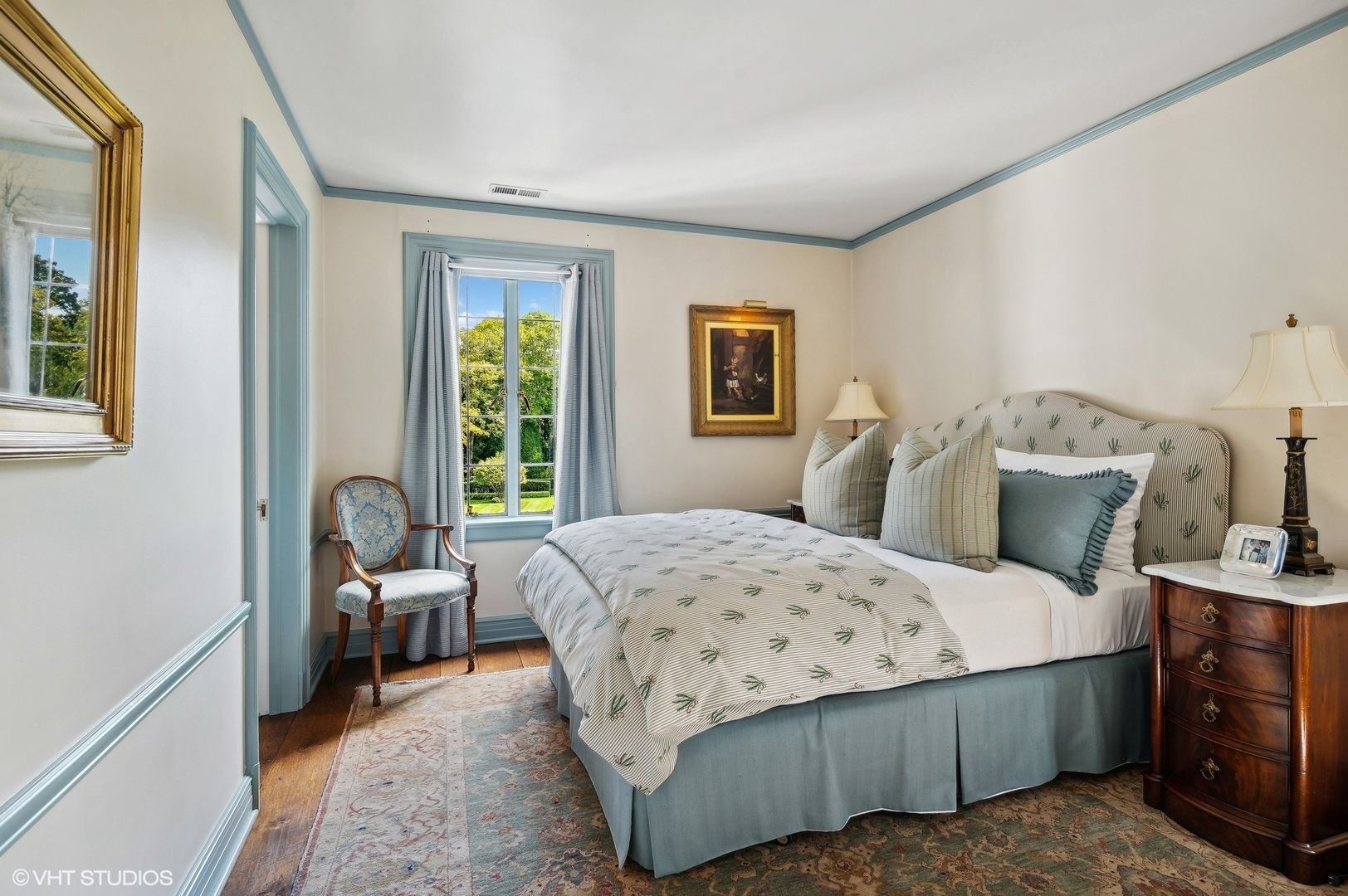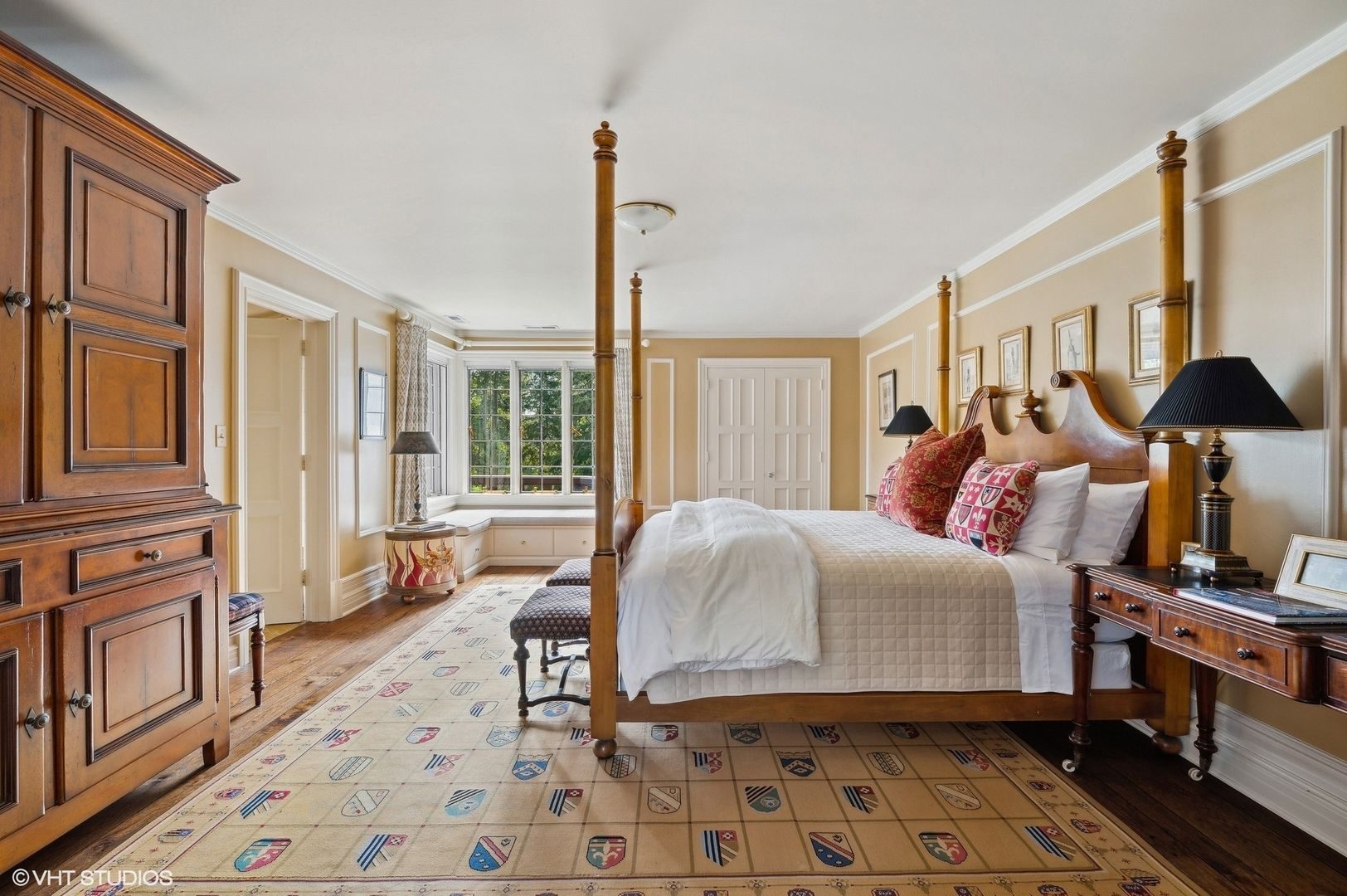 • A delightful hexagonal breakfast room features hand-painted moldings and leaded glass windows, offering a charming space to start the day.