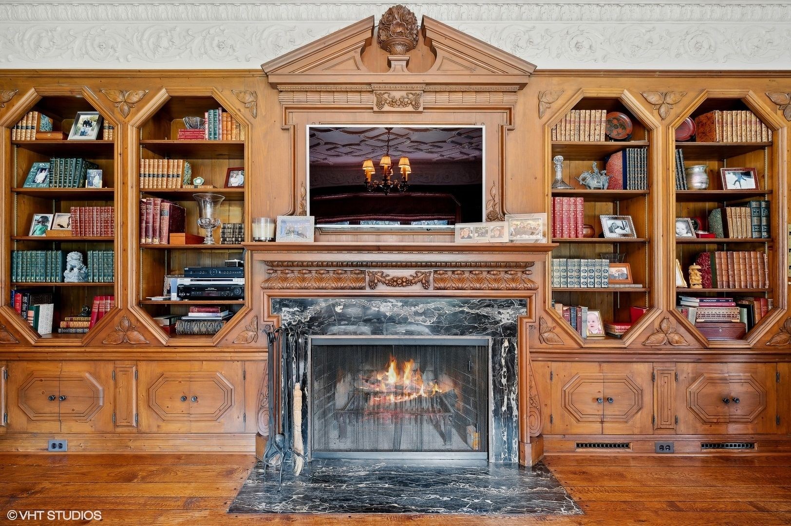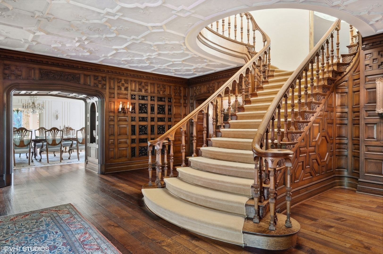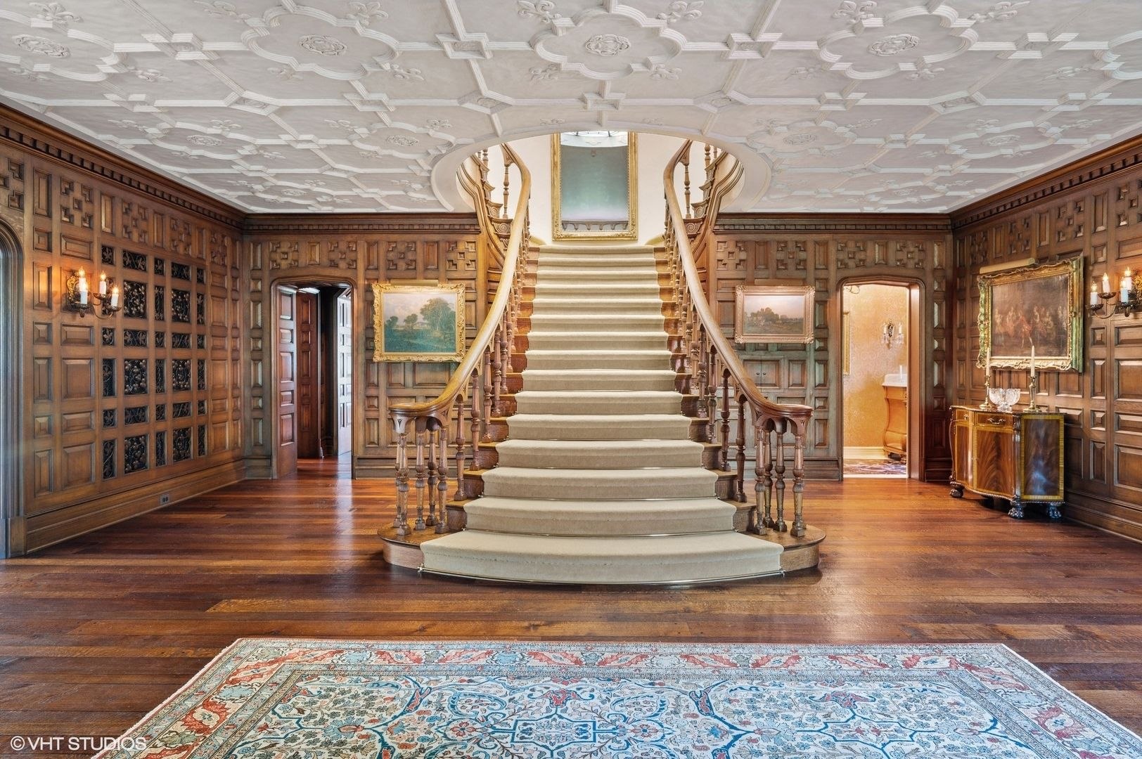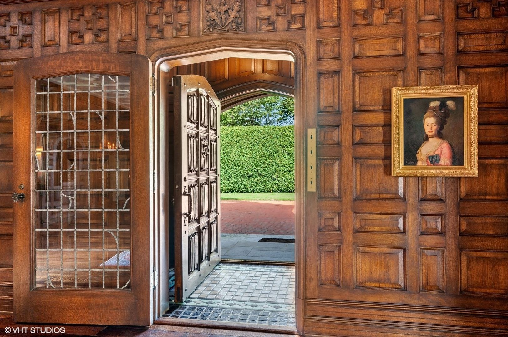 Step into the stunning entrance foyer adorned with unparalleled woodwork, intricate moldings, and hand-scraped floors, featuring a grand staircase crowned by an exquisite Tiffany skylight. Formal living spaces boast leaded glass windows, fireplaces, and outstanding architectural details, creating a luxurious ambiance.