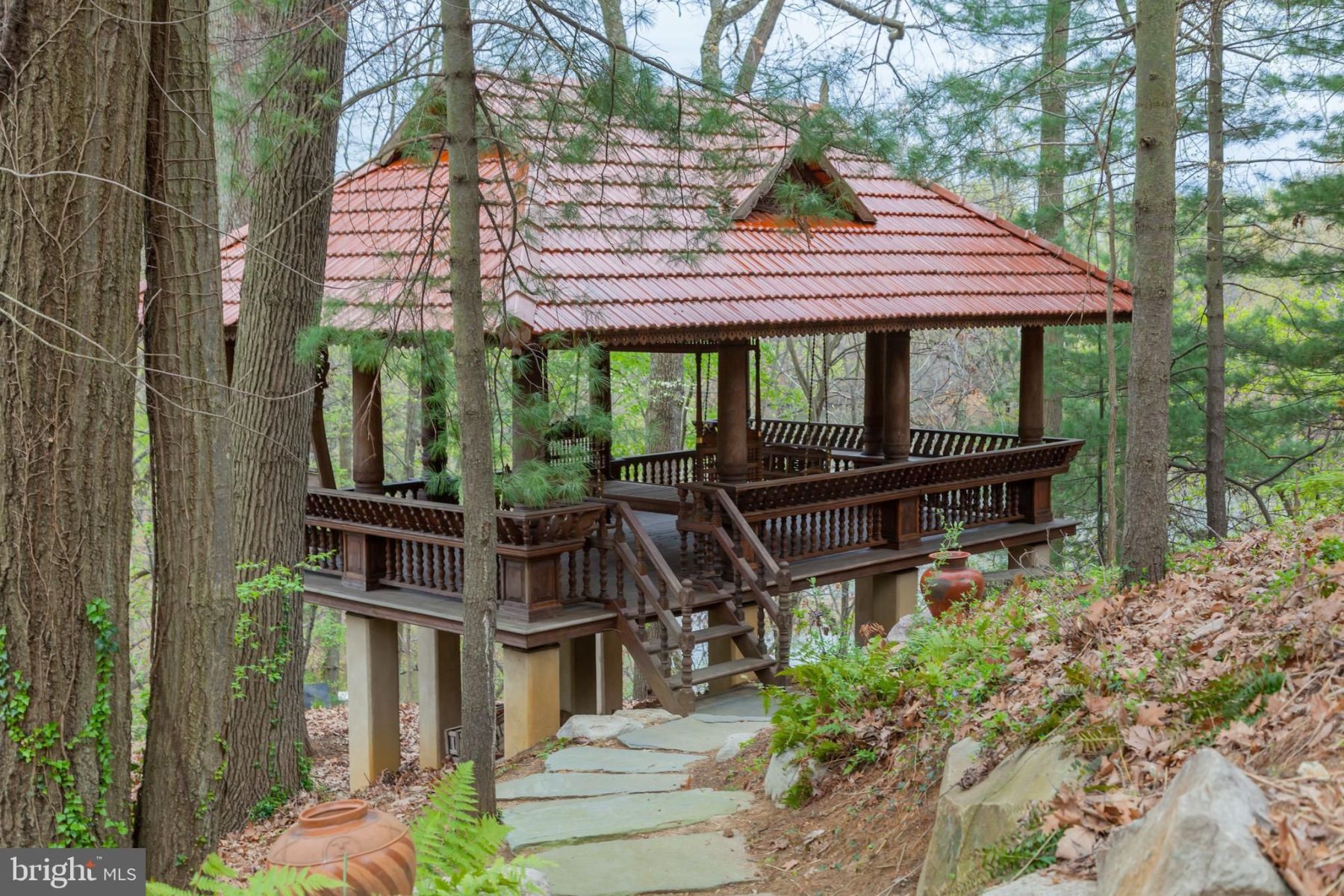 Outside, the estate boasts spectacular 270-degree river views, a nine-car garage, roof garden, pool pavilion, 60-foot infinity-edge pool, tennis court, and direct access to a 6-slip private dock with a boat lift. The property also includes additional structures such as a three-bedroom guest/staff house and an Asian tea house.