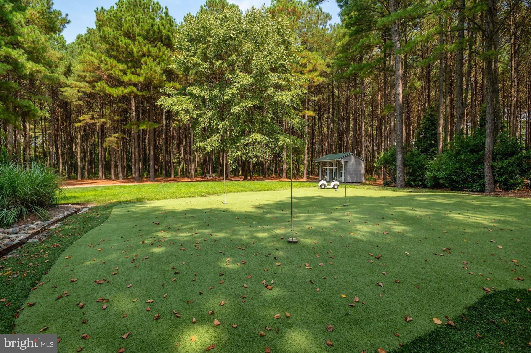 Outside, the property is adorned with extensive landscaping, a waterside pool, pier with 4′ MLW (mean low water), a pine grove, putting green, and a covered porch with a gas fireplace. The shoreline is fully rip-rapped with natural plantings, and the pier offers ample space for boating and water activities.