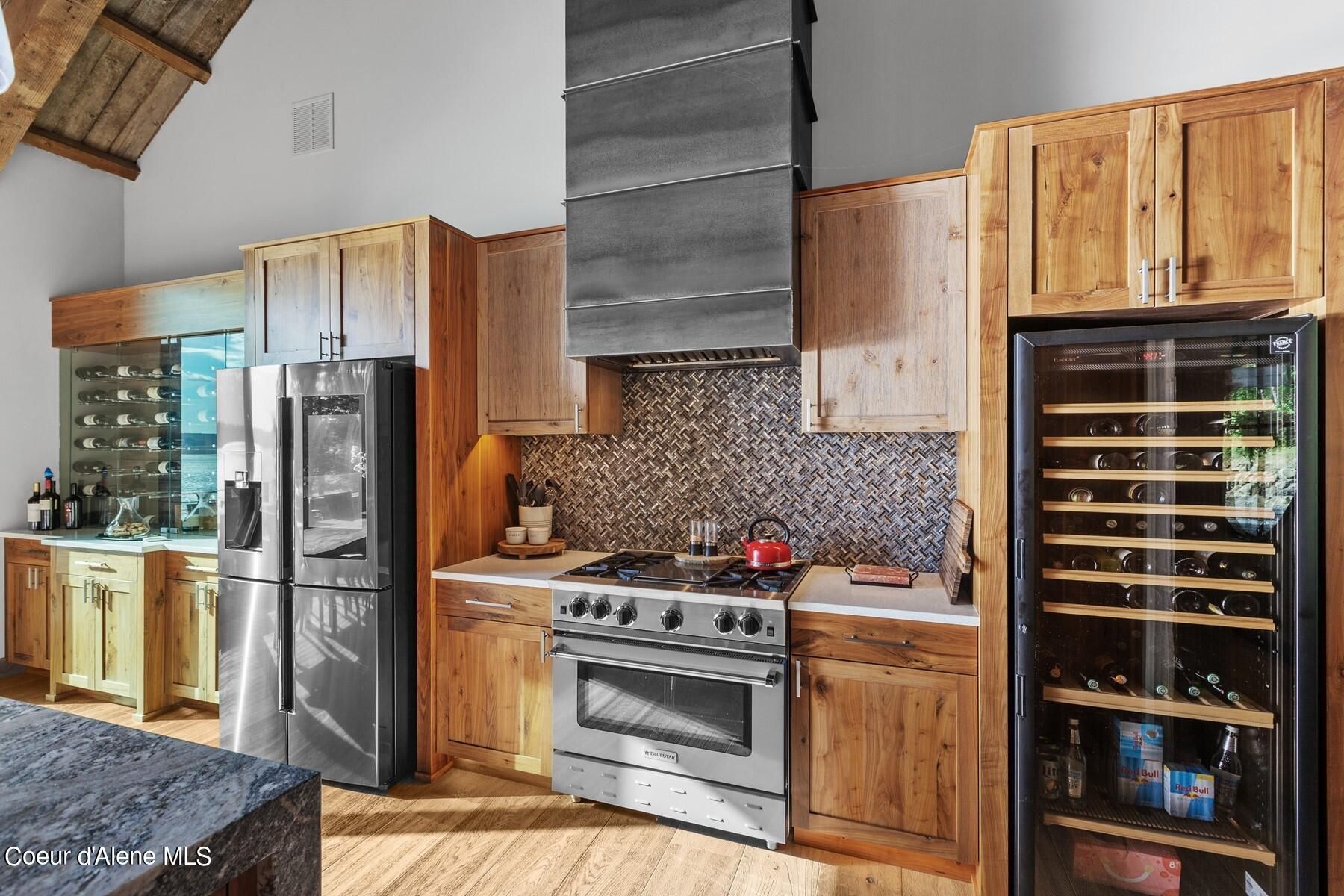 - The culinary enthusiast will appreciate the gourmet kitchen equipped with top-of-the-line stainless steel appliances, a wine tower, and a wine wall, ensuring every meal is a delight.