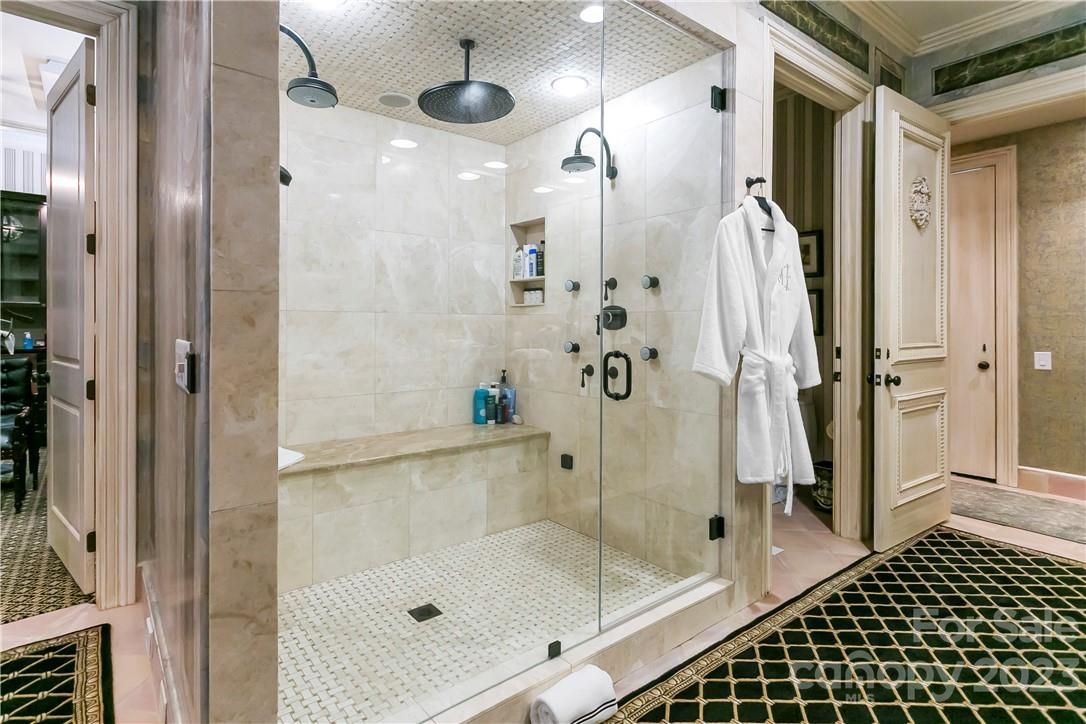 - The owner’s suite features separate bathrooms, a steam shower, sauna, two custom closets, and a private outdoor oasis with a shower, bathtub, and waterfall.