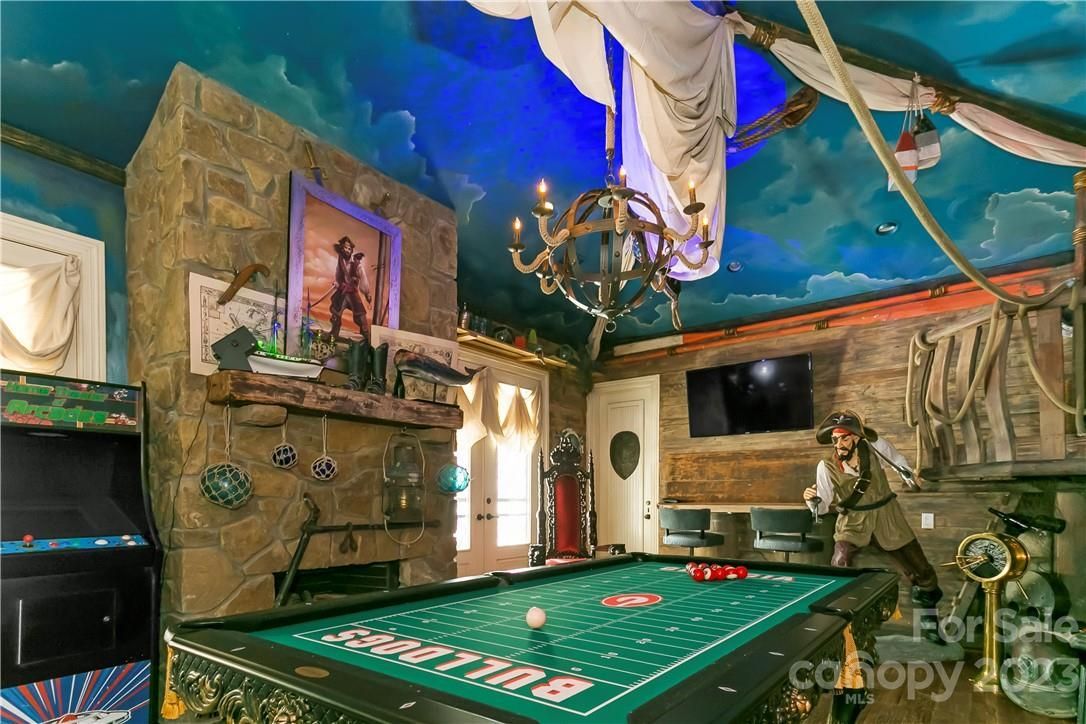 - The gourmet kitchen, pirate-themed game room, and private patio with a koi pond are perfect for entertaining guests.