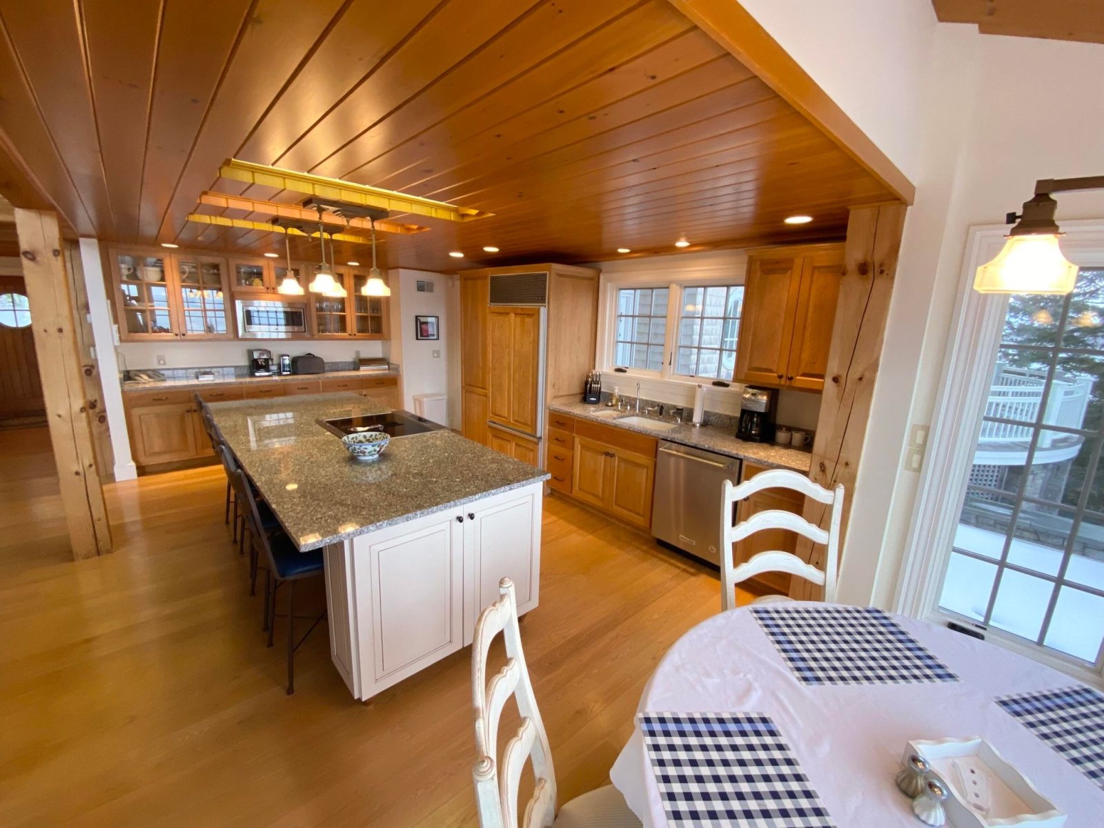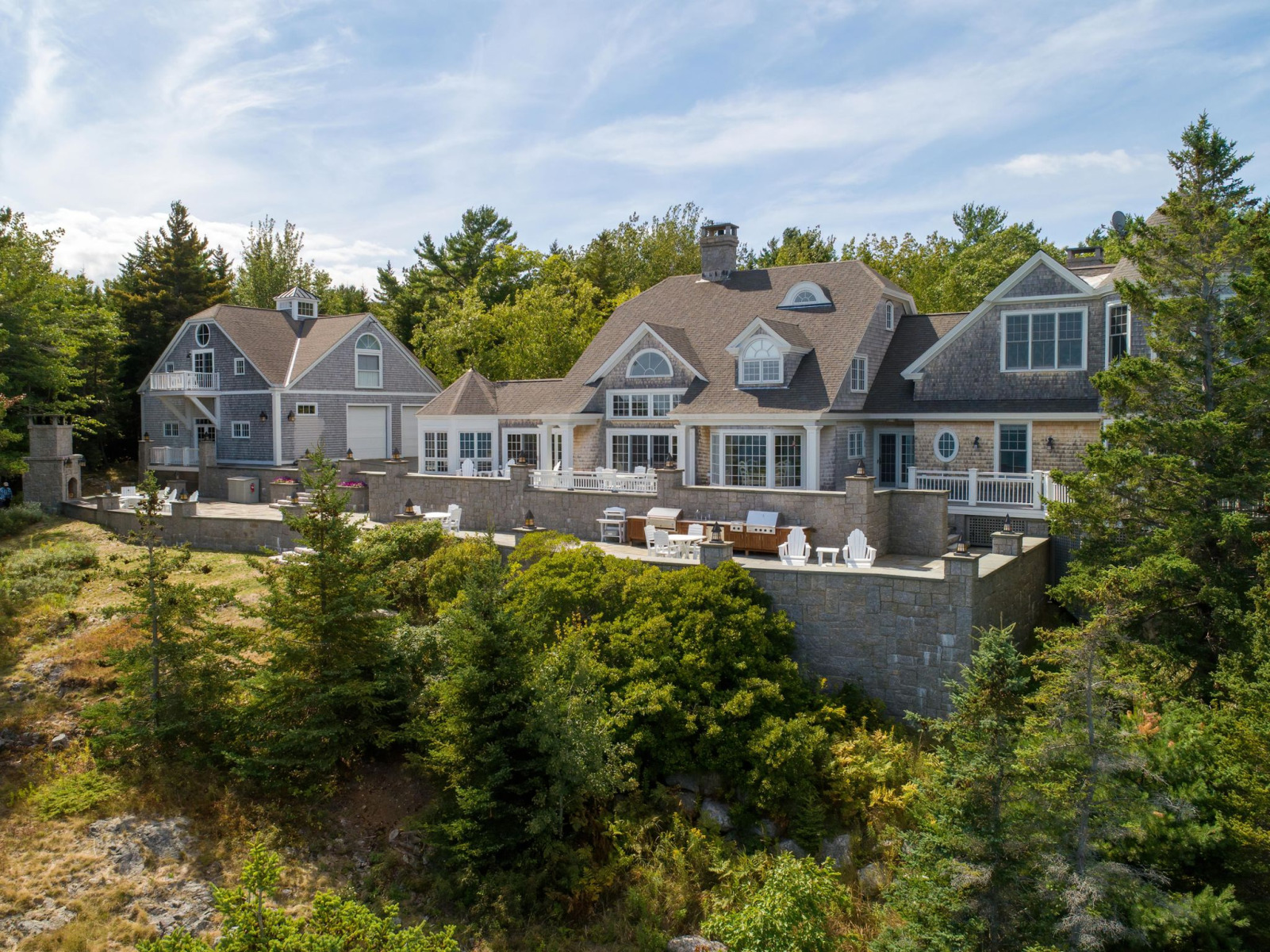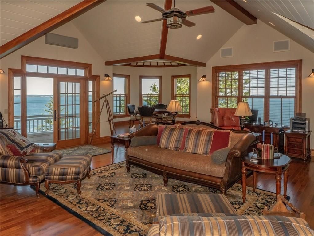 The main house features a timeless John Libby timber frame design with a three-story cathedral living area, adorned with a granite fireplace and offering panoramic views of the bay.