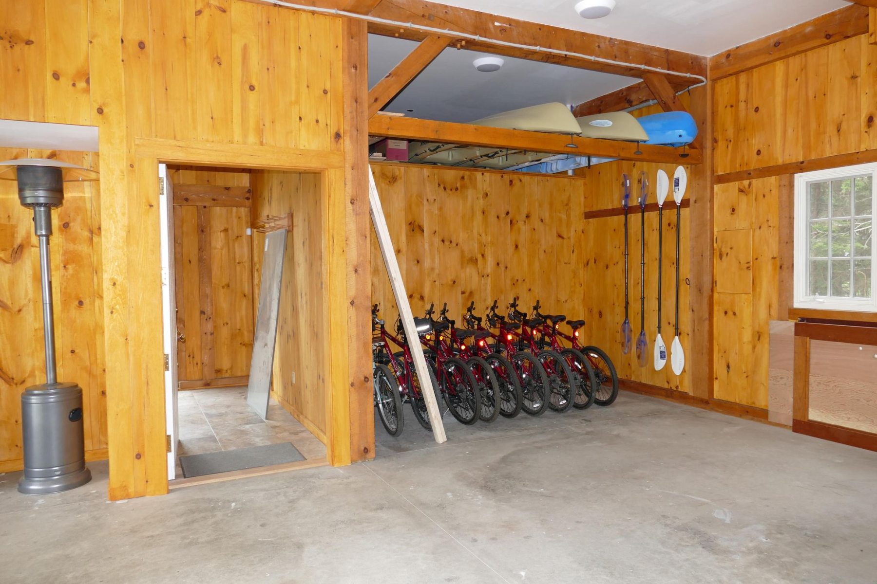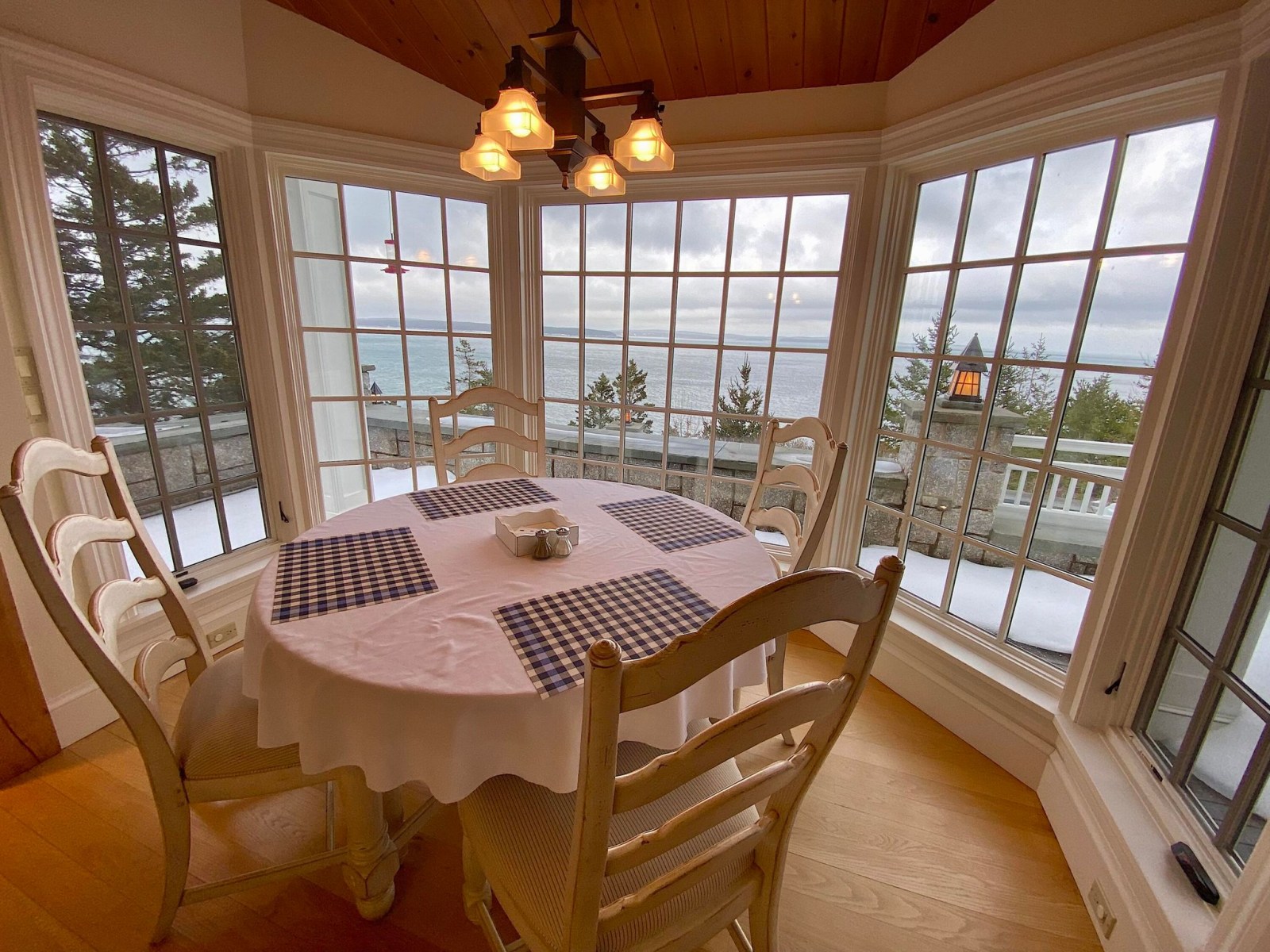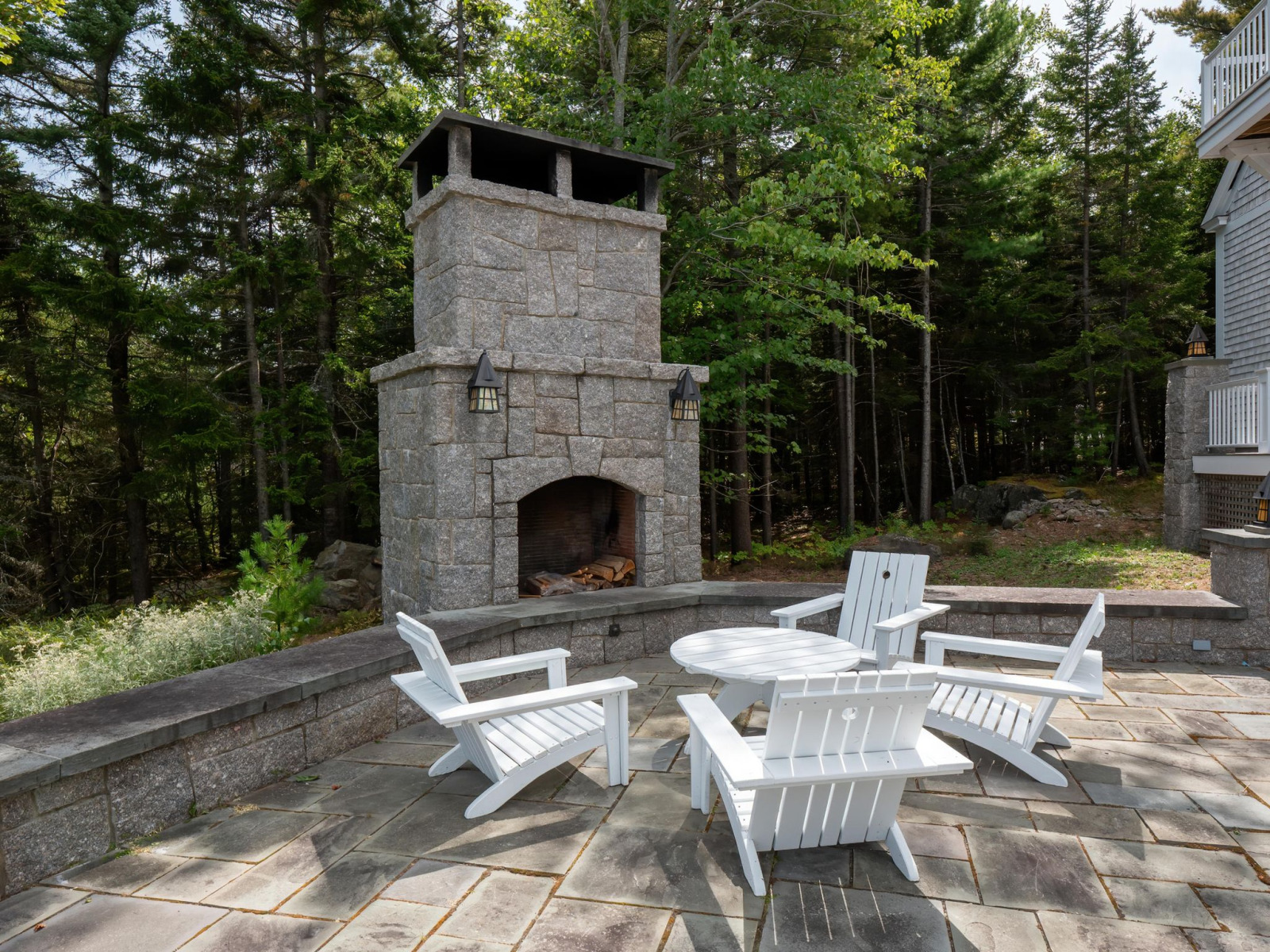 The main house features a timeless John Libby timber frame design with a three-story cathedral living area, adorned with a granite fireplace and offering panoramic views of the bay.