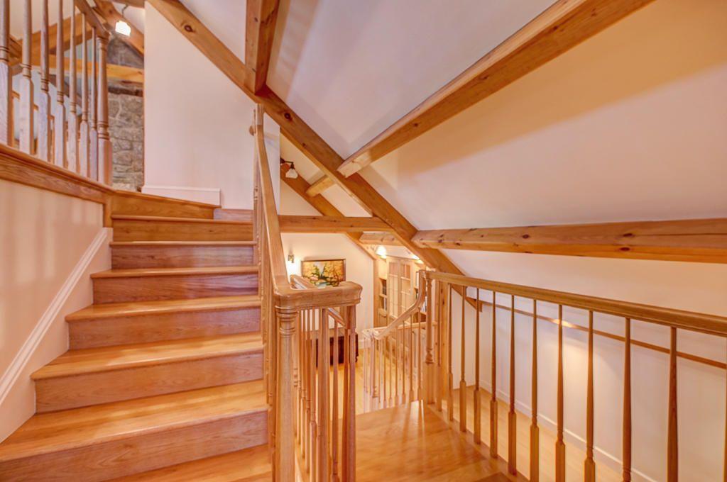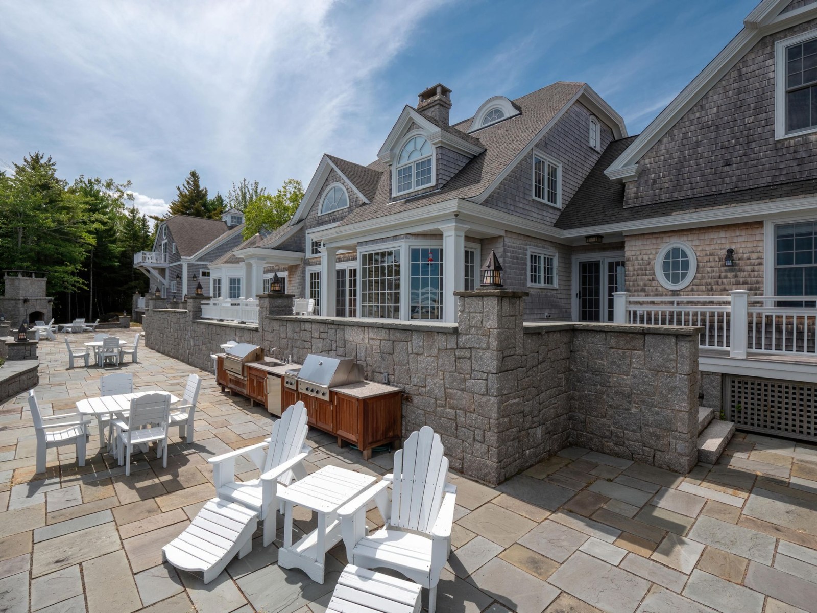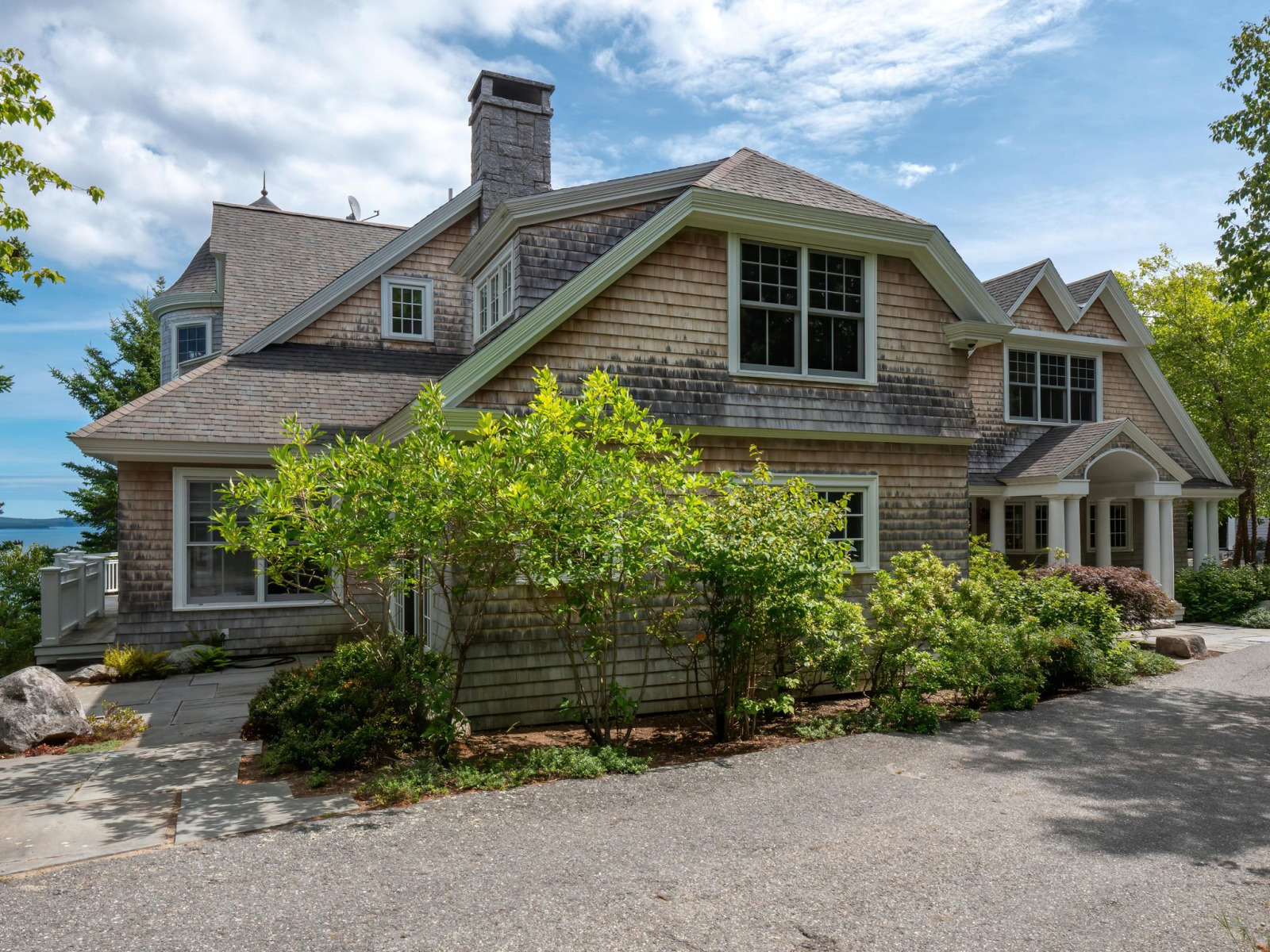The main house features a timeless John Libby timber frame design with a three-story cathedral living area, adorned with a granite fireplace and offering panoramic views of the bay.