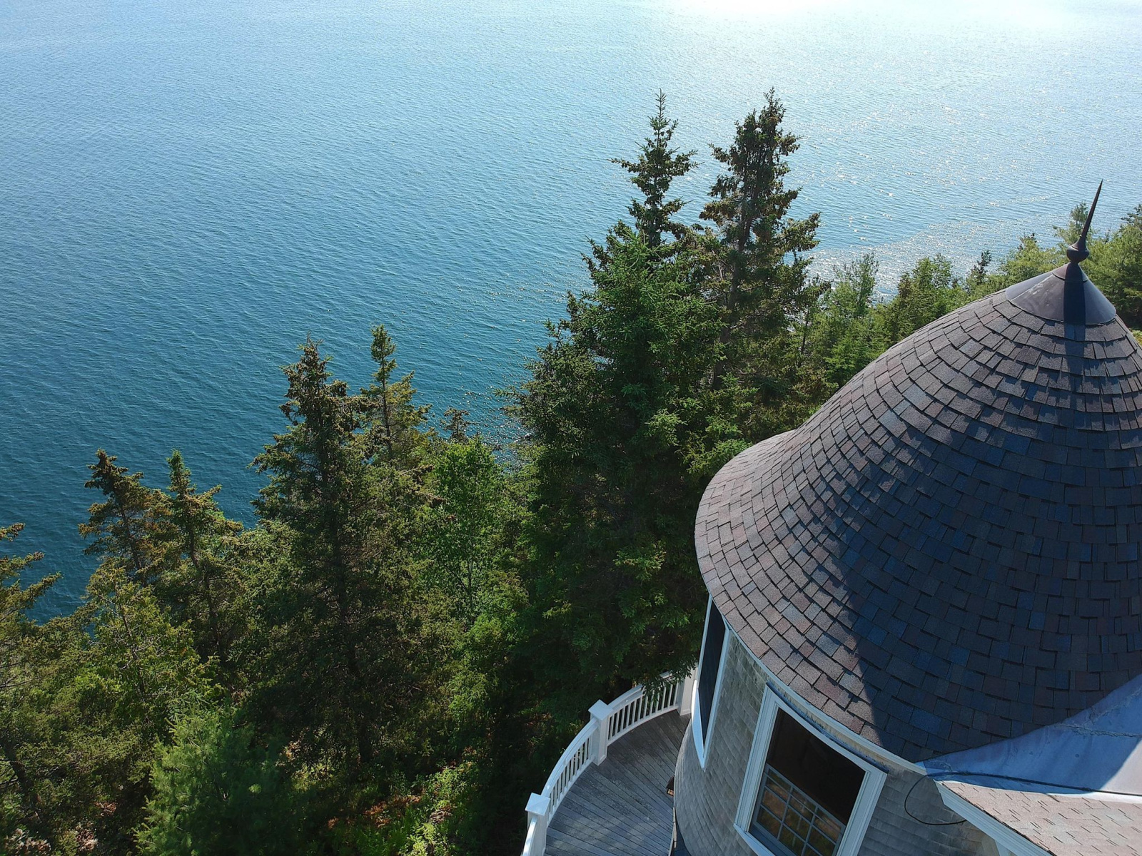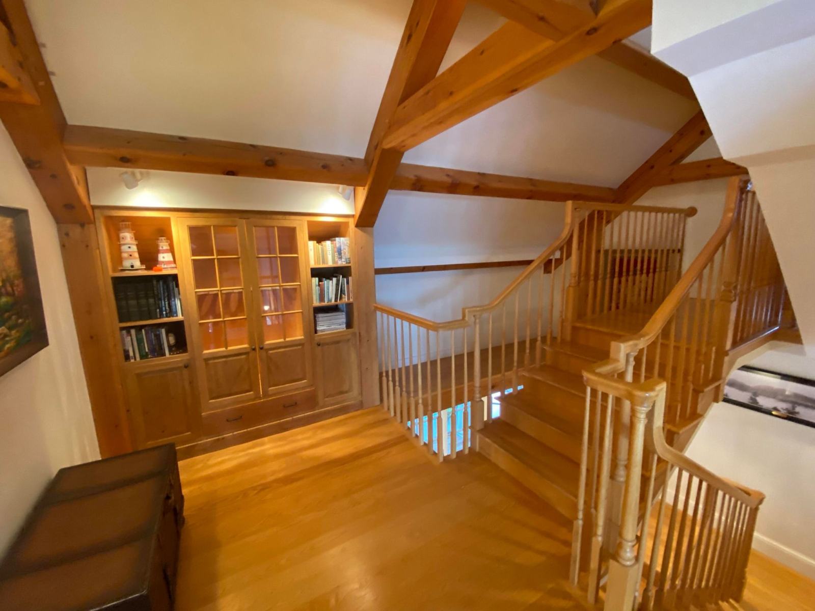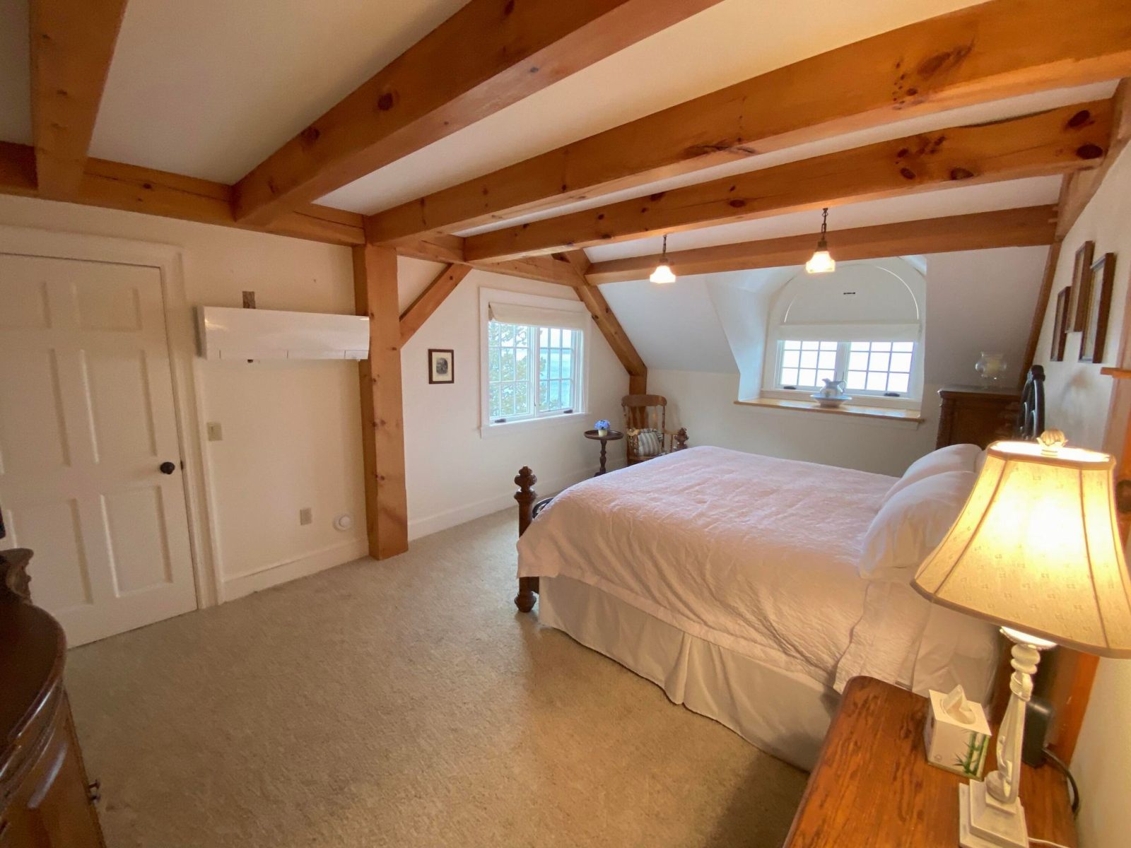 The main house features a timeless John Libby timber frame design with a three-story cathedral living area, adorned with a granite fireplace and offering panoramic views of the bay.