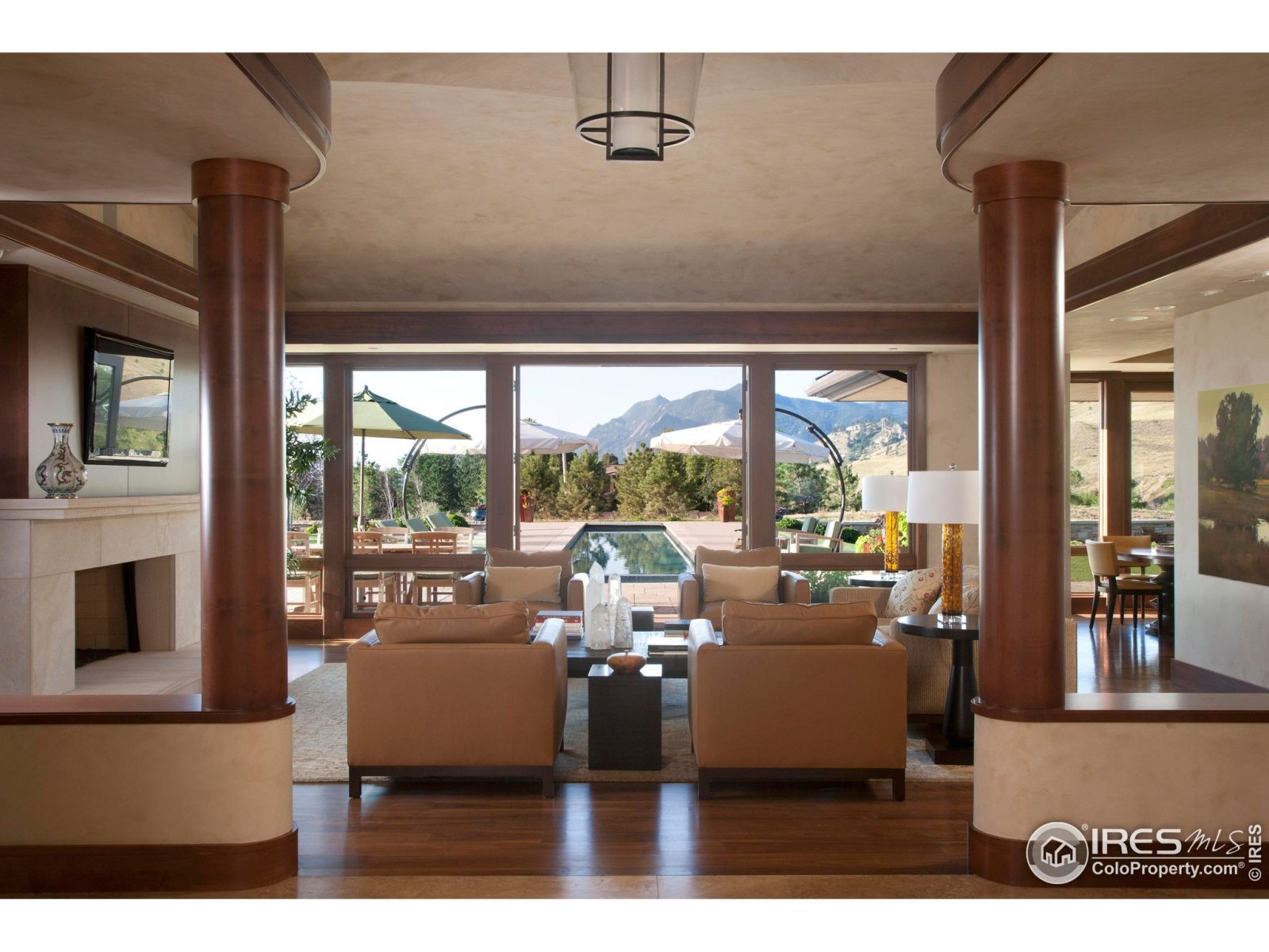 The property offers resort-like amenities, including a 90-foot lap pool, a hot tub surrounded by a stone deck, and an al fresco Viking kitchen, perfect for outdoor entertaining. Inside, four limestone fireplaces, travertine and walnut floors, and state-of-the-art systems elevate the living experience to new heights of luxury. The primary retreat offers postcard views, a striking fireplace, and an opulent onyx and marble bath, creating a serene oasis for relaxation.
