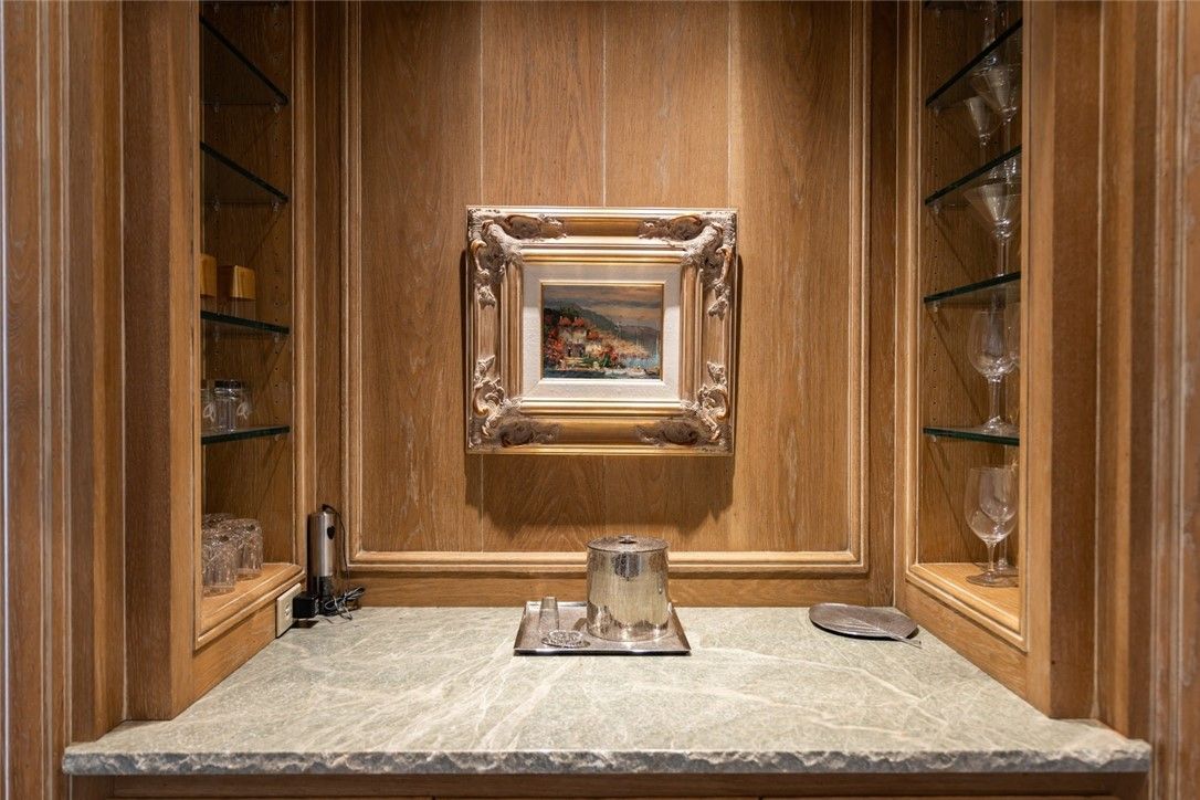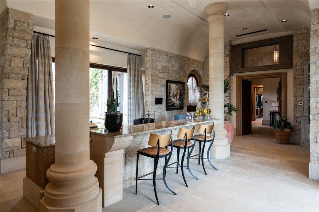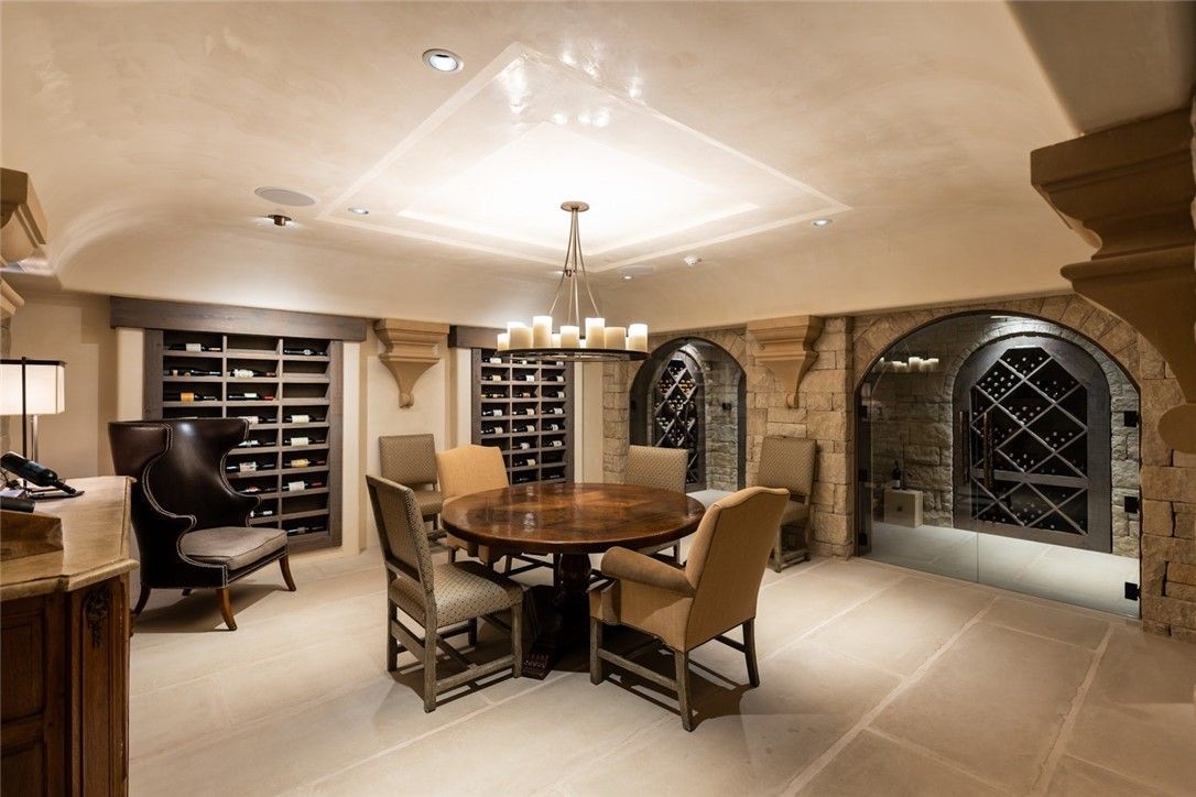The primary suite is a sanctuary of relaxation, featuring a fireplace, private courtyard views, and access to a 12-person hot tub. The ensuite bathroom boasts marble showers, custom closets, and luxurious finishes. Additional living spaces include a billiards room, library, and a basement wine cellar that holds 750 bottles, perfect for connoisseurs.