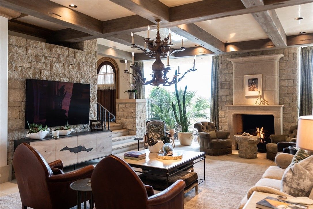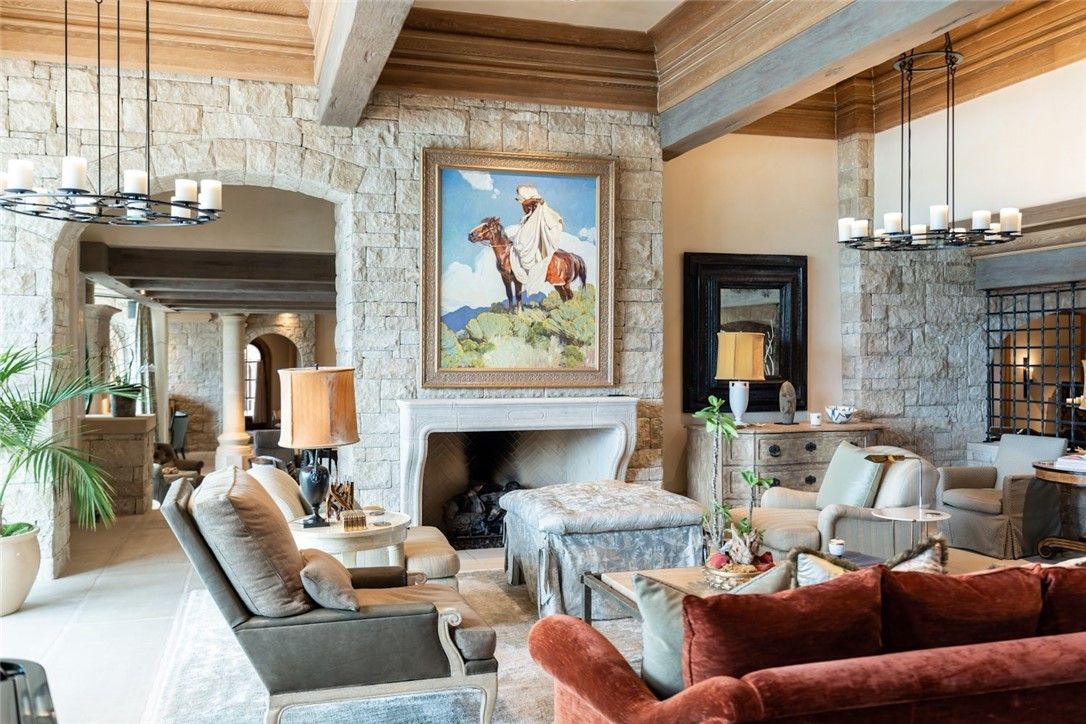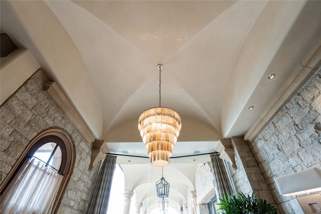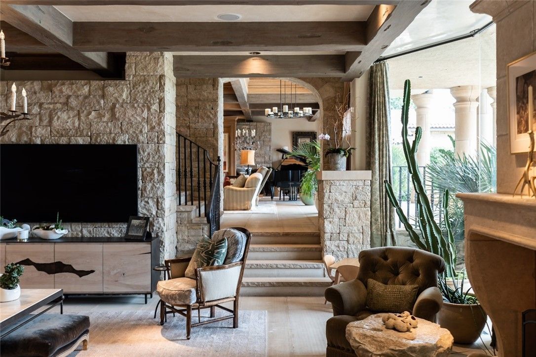 Upon entry, the grandeur of this estate unfolds with a modern take on European architecture. The interior features a seamless blend of opulent elements, including custom ironwork, imported beams, designer chandeliers, handcrafted trim work, and Venetian plaster walls and ceilings throughout. The expansive living spaces are adorned with five fireplaces, adding warmth and sophistication to every room.