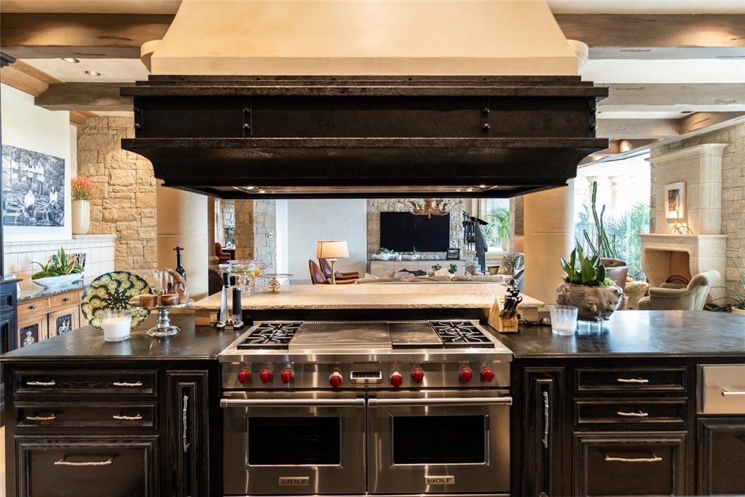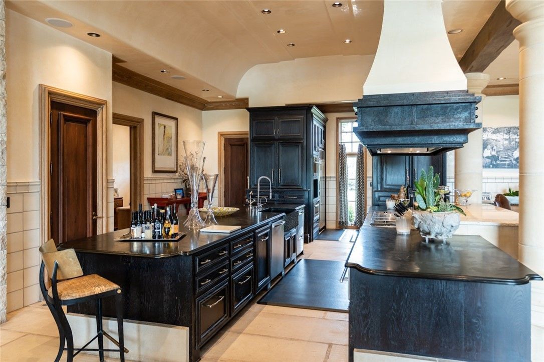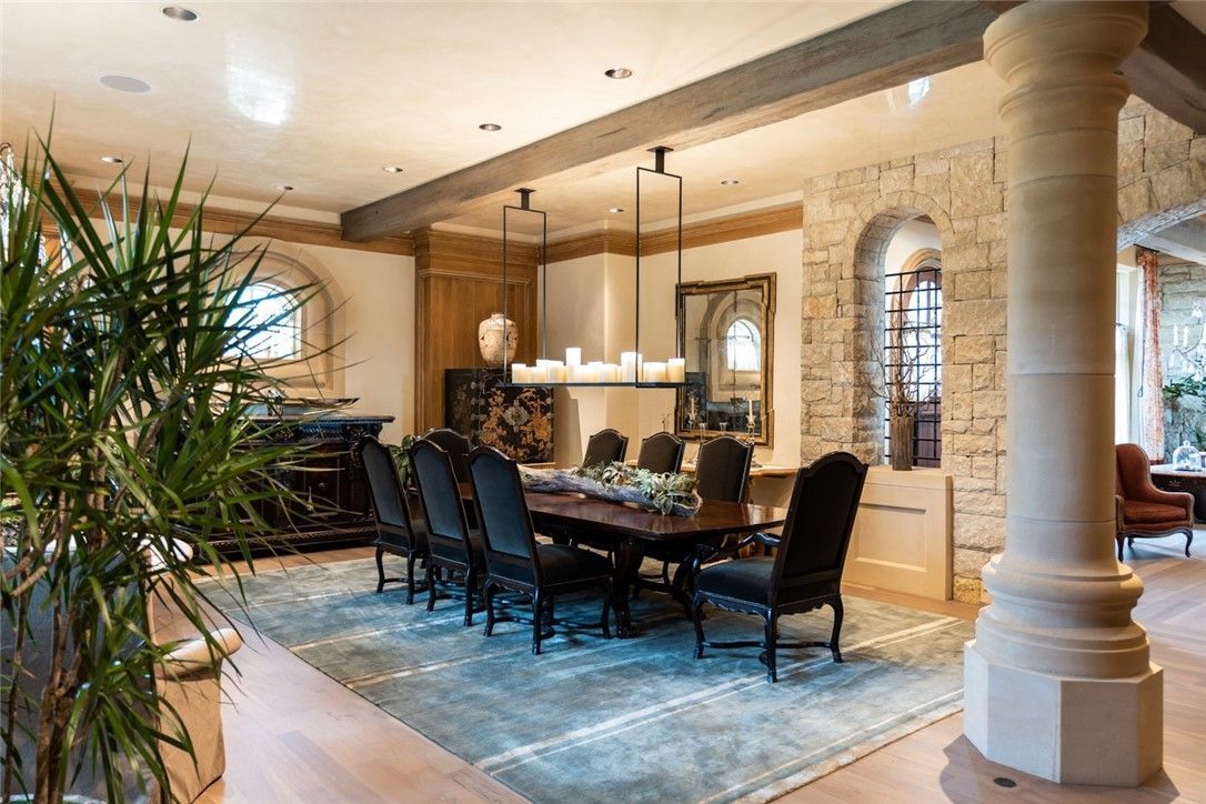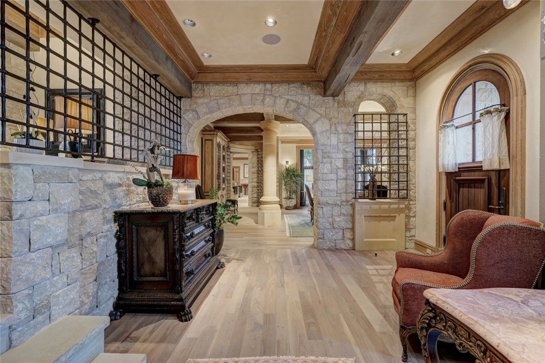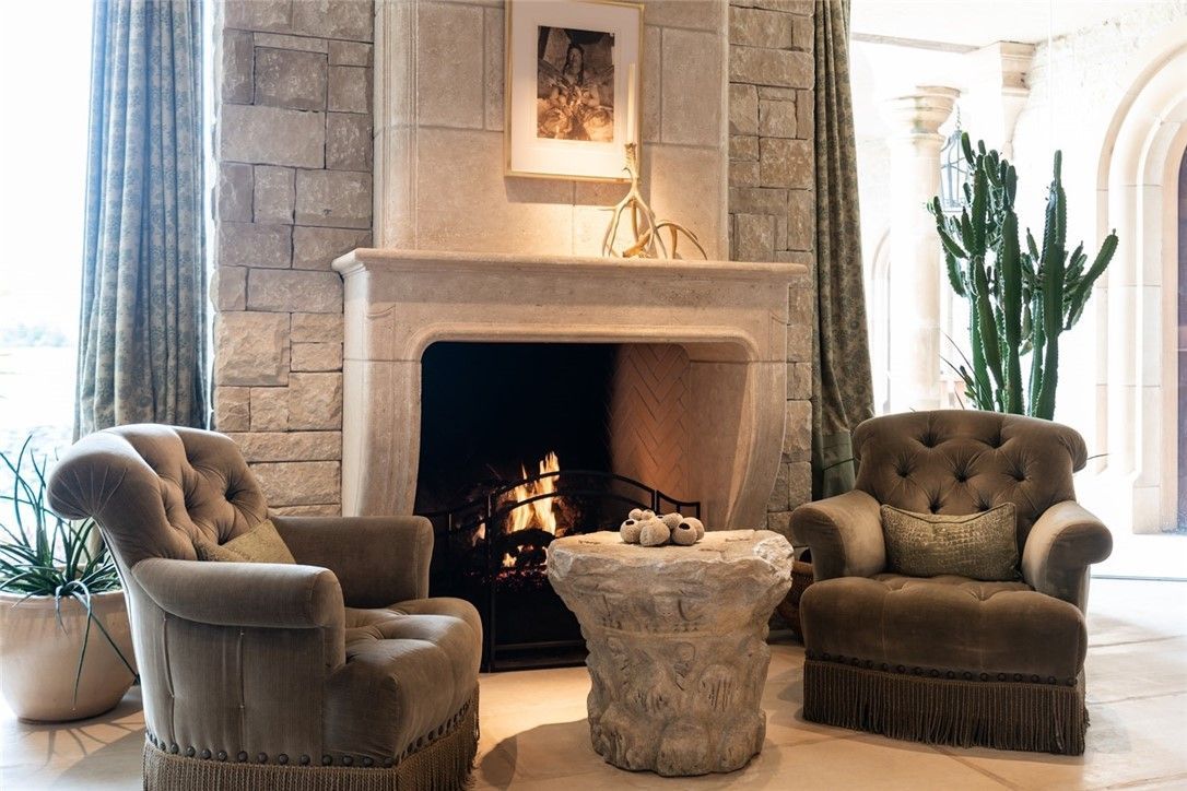 Upon entry, the grandeur of this estate unfolds with a modern take on European architecture. The interior features a seamless blend of opulent elements, including custom ironwork, imported beams, designer chandeliers, handcrafted trim work, and Venetian plaster walls and ceilings throughout. The expansive living spaces are adorned with five fireplaces, adding warmth and sophistication to every room.
