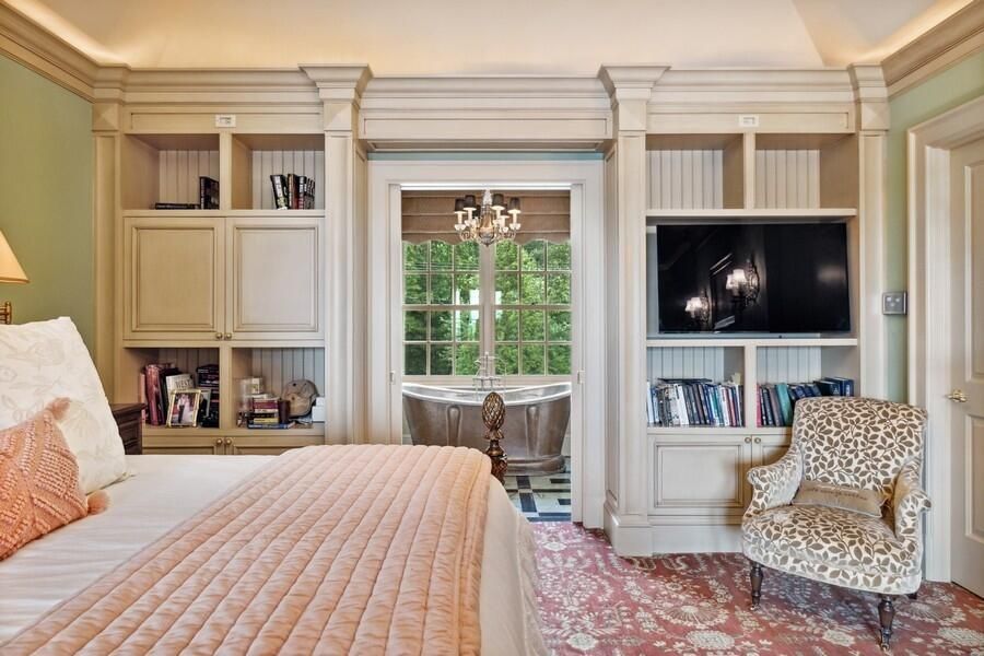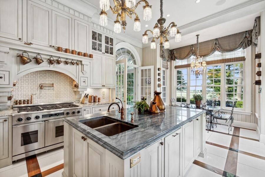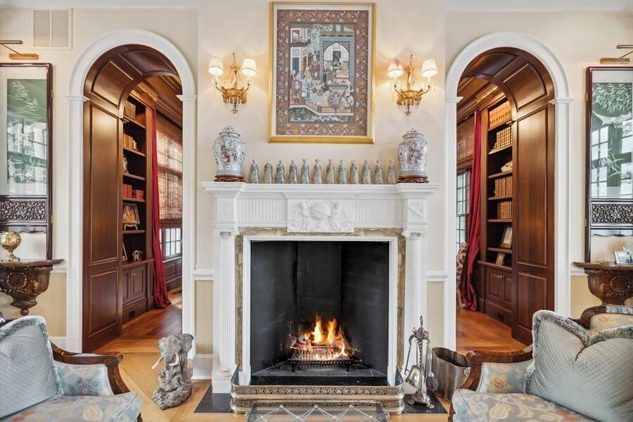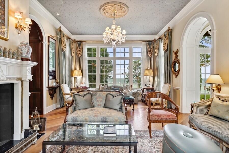 The beautiful gallery with arched French doors opens onto a large stone terrace, perfect for alfresco dining while enjoying views of the lushly landscaped yard and lake. Cozy evenings can be spent in front of one of the nine fireplaces scattered throughout the estate.
