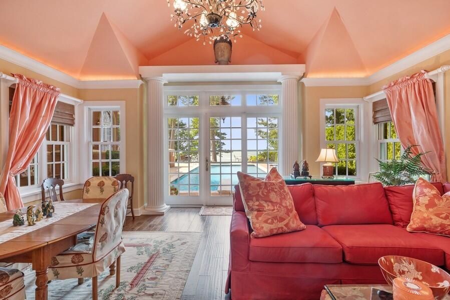 • Primary suite with fireplace, two full baths, office/sitting room, and screened porch.