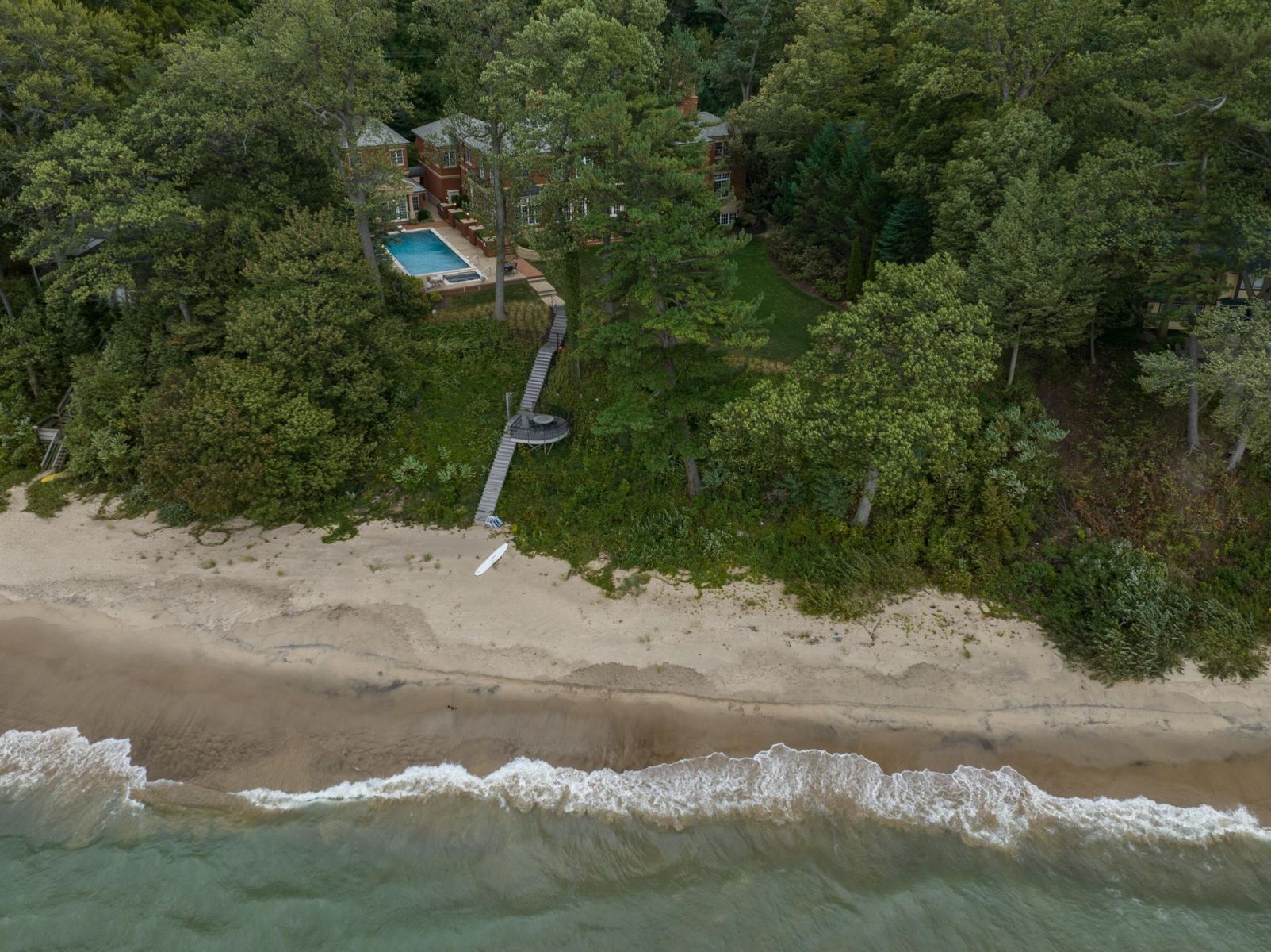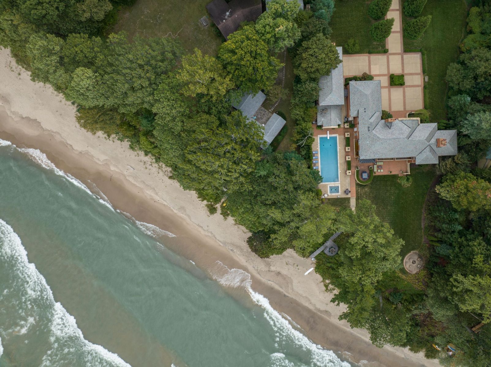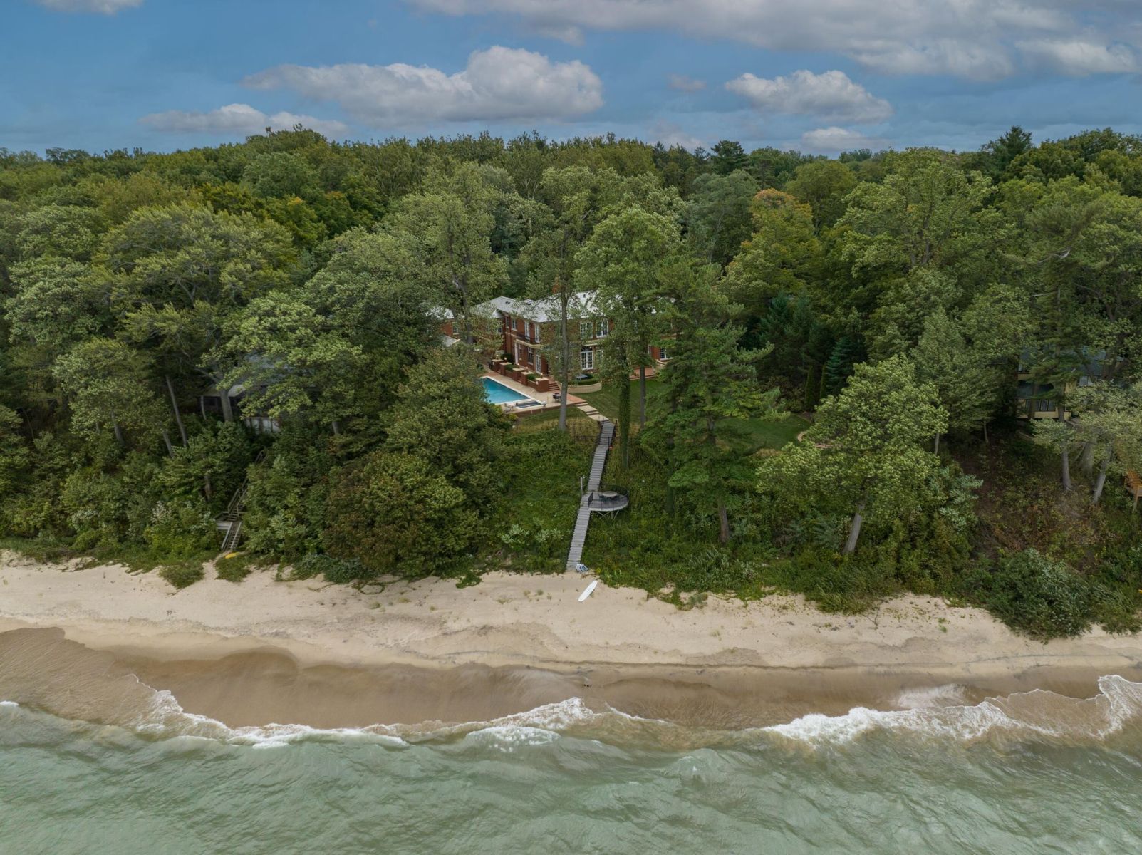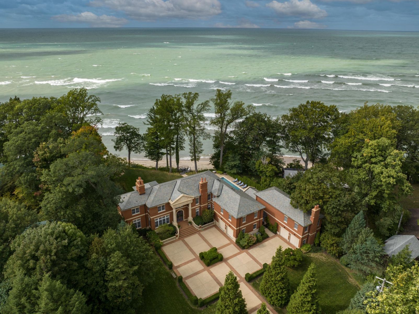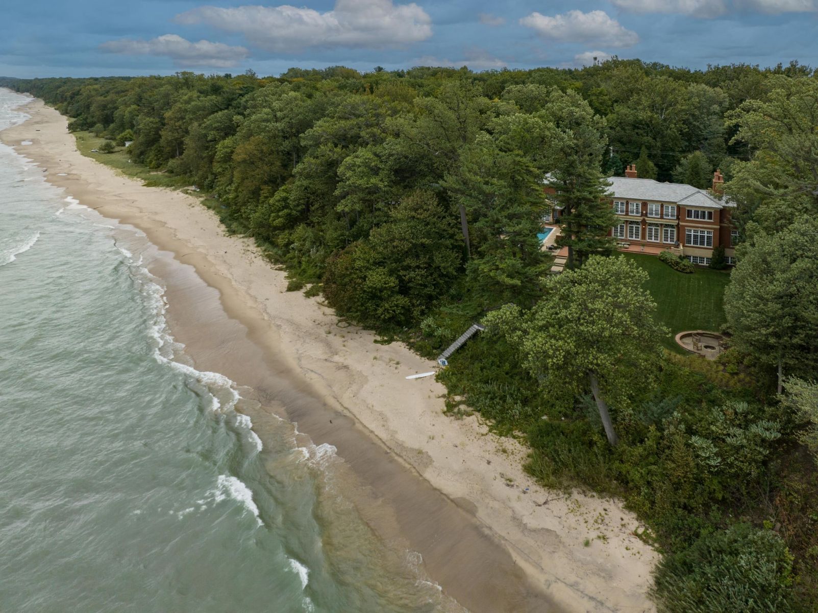 This stately Georgian estate boasts over 148 feet of pristine Lake Michigan frontage, offering breathtaking views and direct access to the water. The property features a 40-foot swimming pool and spa, overlooking a vast sandy beach, providing the ultimate retreat for relaxation and recreation.