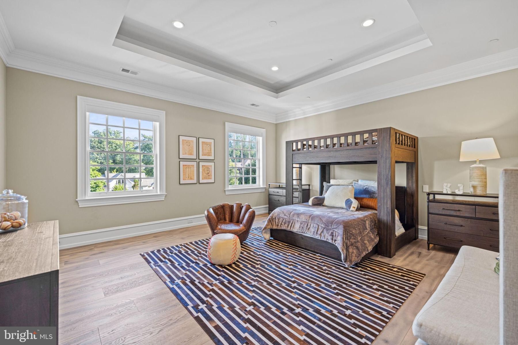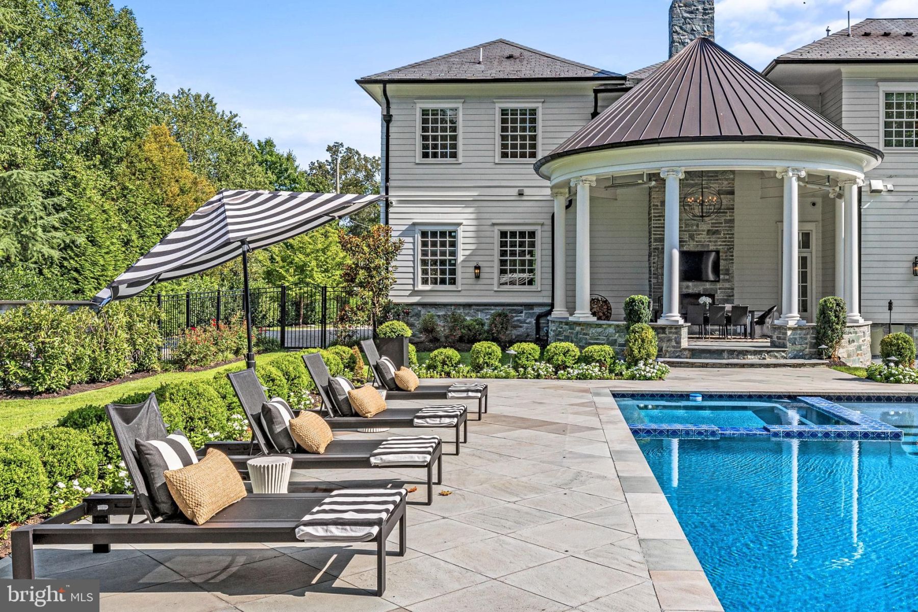 The lower level provides abundant entertainment options including a full wet bar, sprawling recreation room, fitness center, private card room, and a 6th bedroom suite. The fully fenced backyard is a paradise featuring a spectacular pool area, sport court, and vast lawn.
