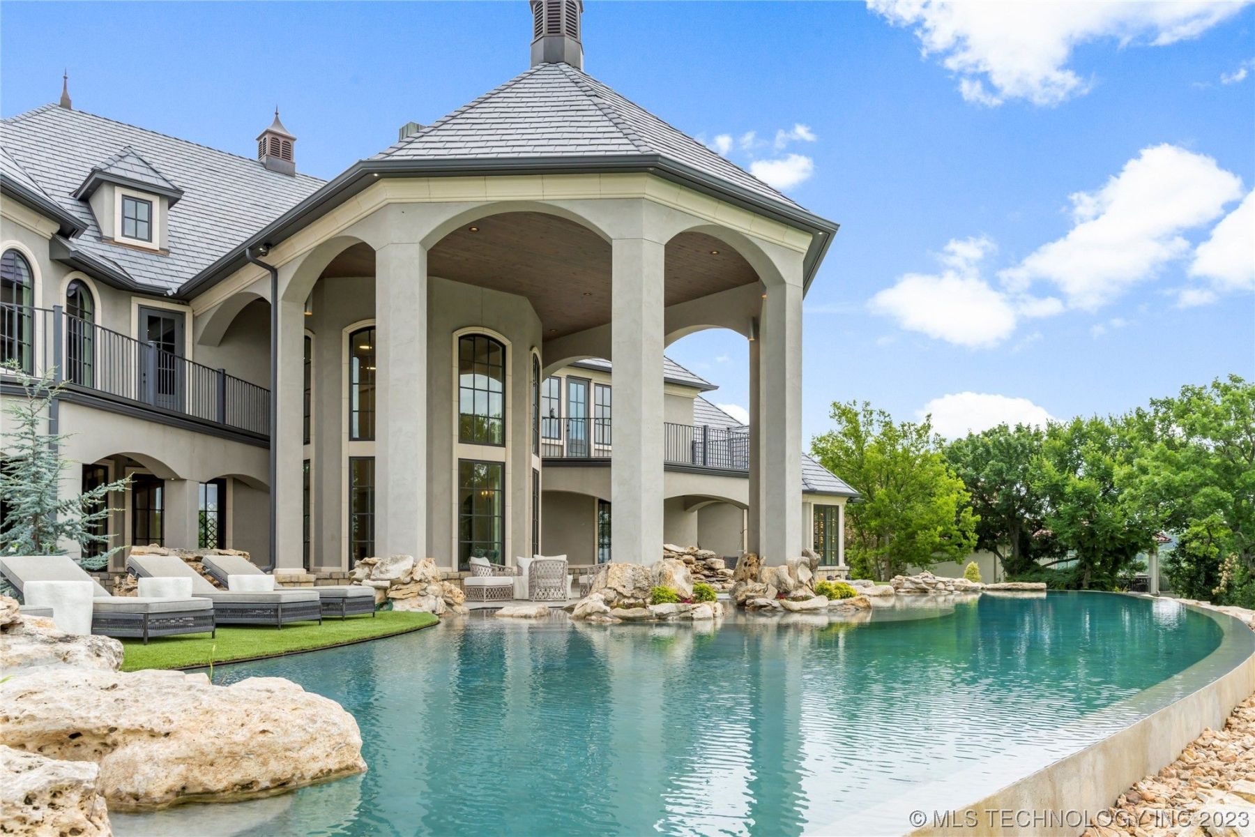 The outdoor area is a true retreat, featuring two resort-style pools, an Endless swim spa, tidal pools, tanning shelves, and grottos with fountains, creating a luxurious and relaxing environment. An expansive patio and deck offer ample space for outdoor dining and lounging, while the breathtaking views of the Bluffs provide a picturesque backdrop for gatherings.