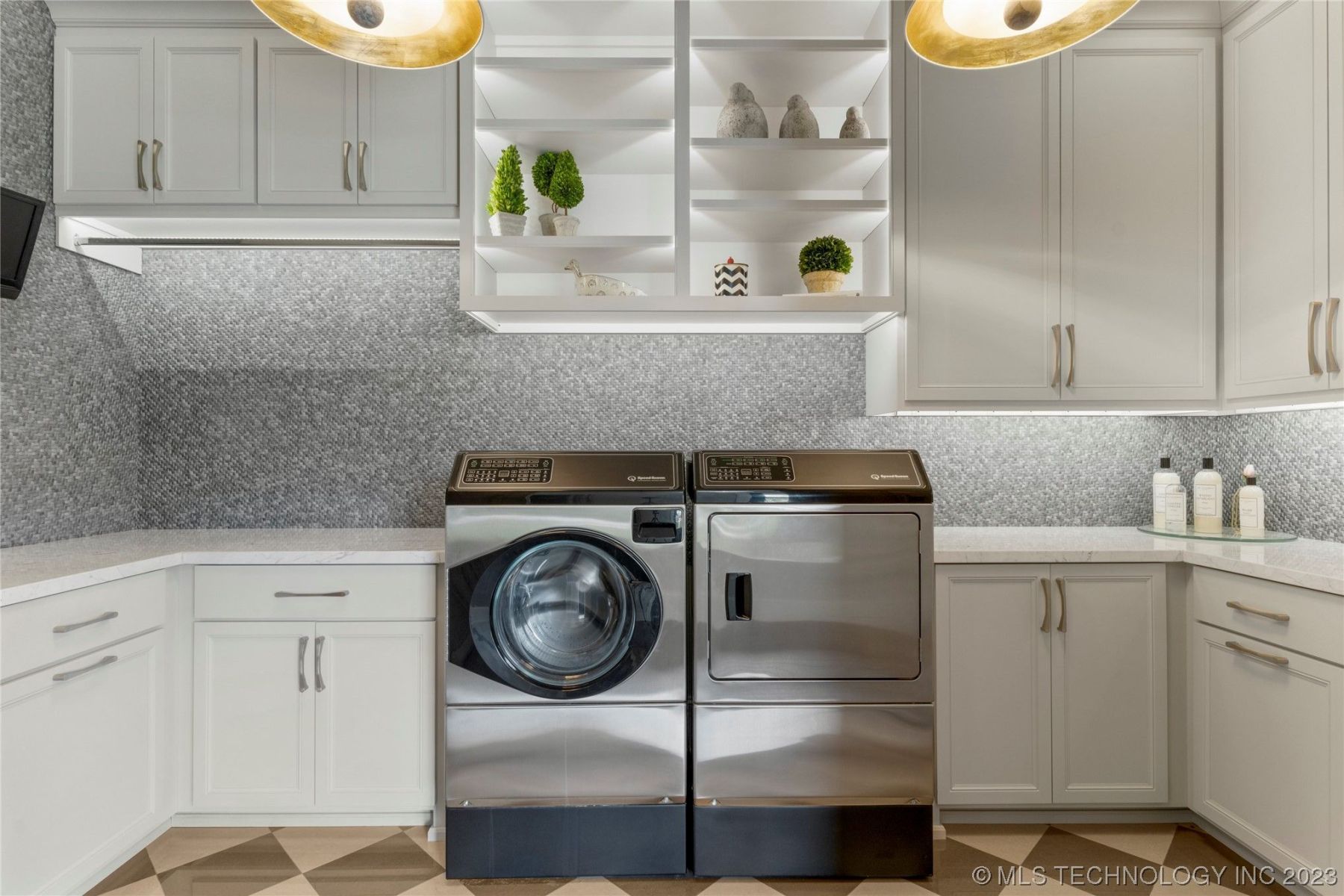 Entertaining guests is effortless with the plethora of amenities this mansion has to offer. A fully equipped kitchen, complete with double islands, SubZero fridge & freezer, Thermador range & double oven, and Scotsman ice machine, ensures that culinary endeavors are a breeze. A downstairs guest bedroom with a private bath provides comfort and privacy for visitors. The property also includes three laundry rooms for added convenience.
