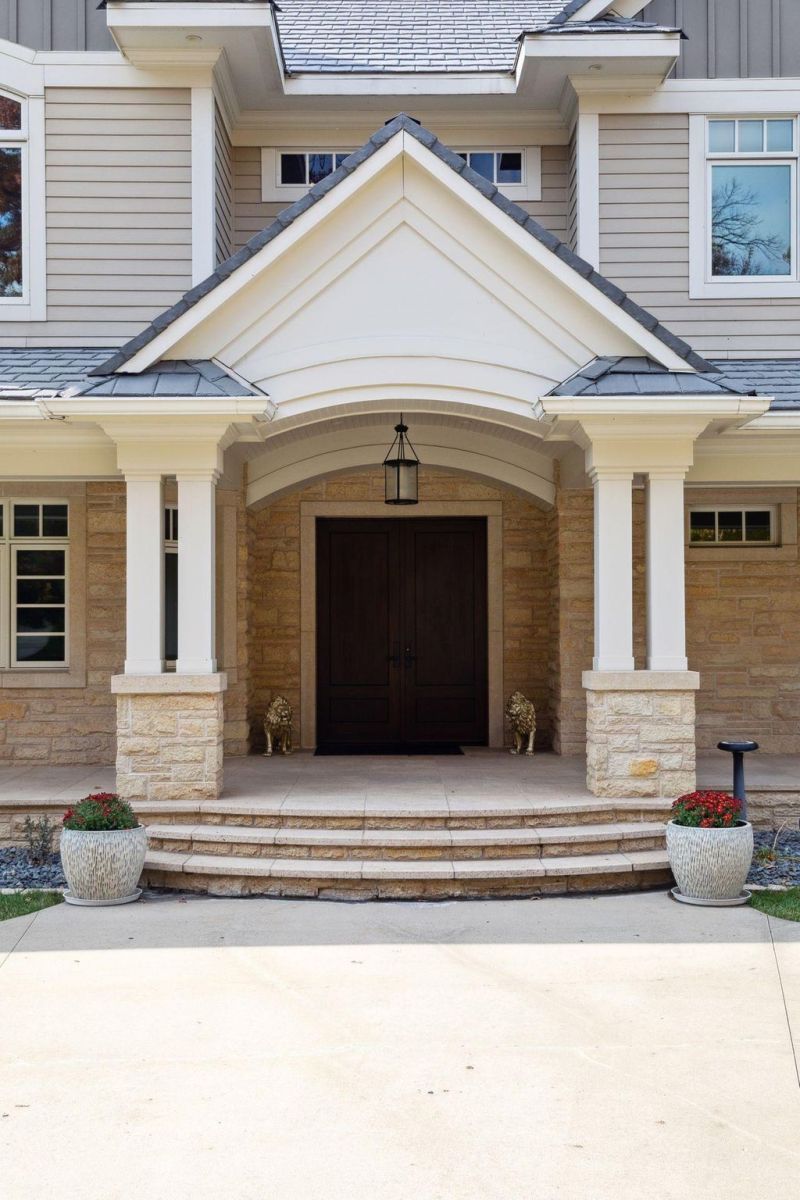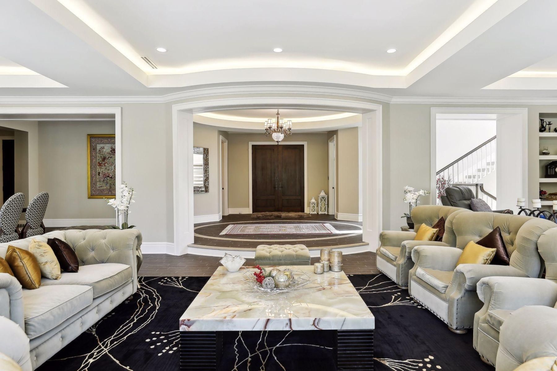 This smart home seamlessly blends technology with elegance to cater to the needs of a luxurious lifestyle. The outdoor space features a pool deck and hot tub, surrounded by lush landscaping. A stone staircase adds to the grandeur of the exterior, setting the tone for the opulence within.