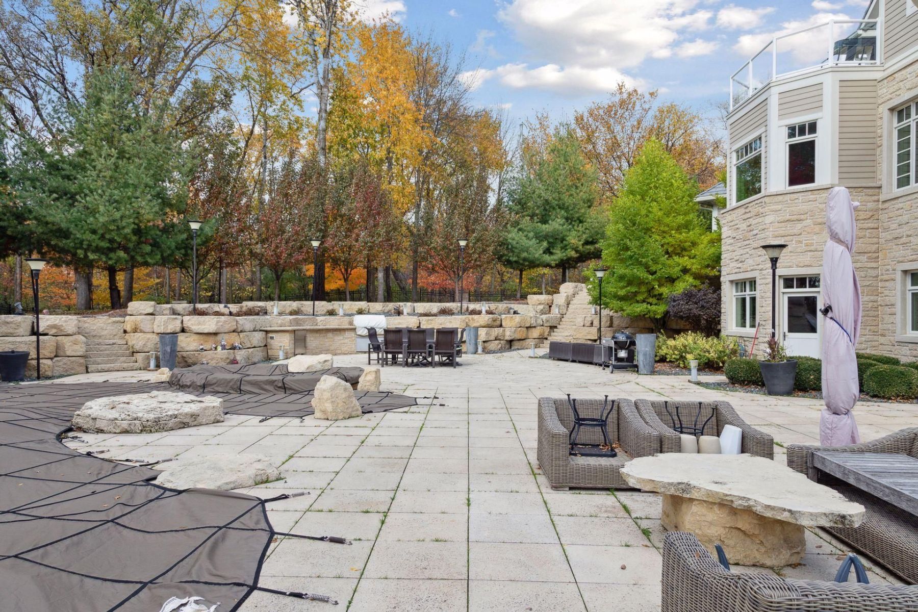 This smart home seamlessly blends technology with elegance to cater to the needs of a luxurious lifestyle. The outdoor space features a pool deck and hot tub, surrounded by lush landscaping. A stone staircase adds to the grandeur of the exterior, setting the tone for the opulence within.
