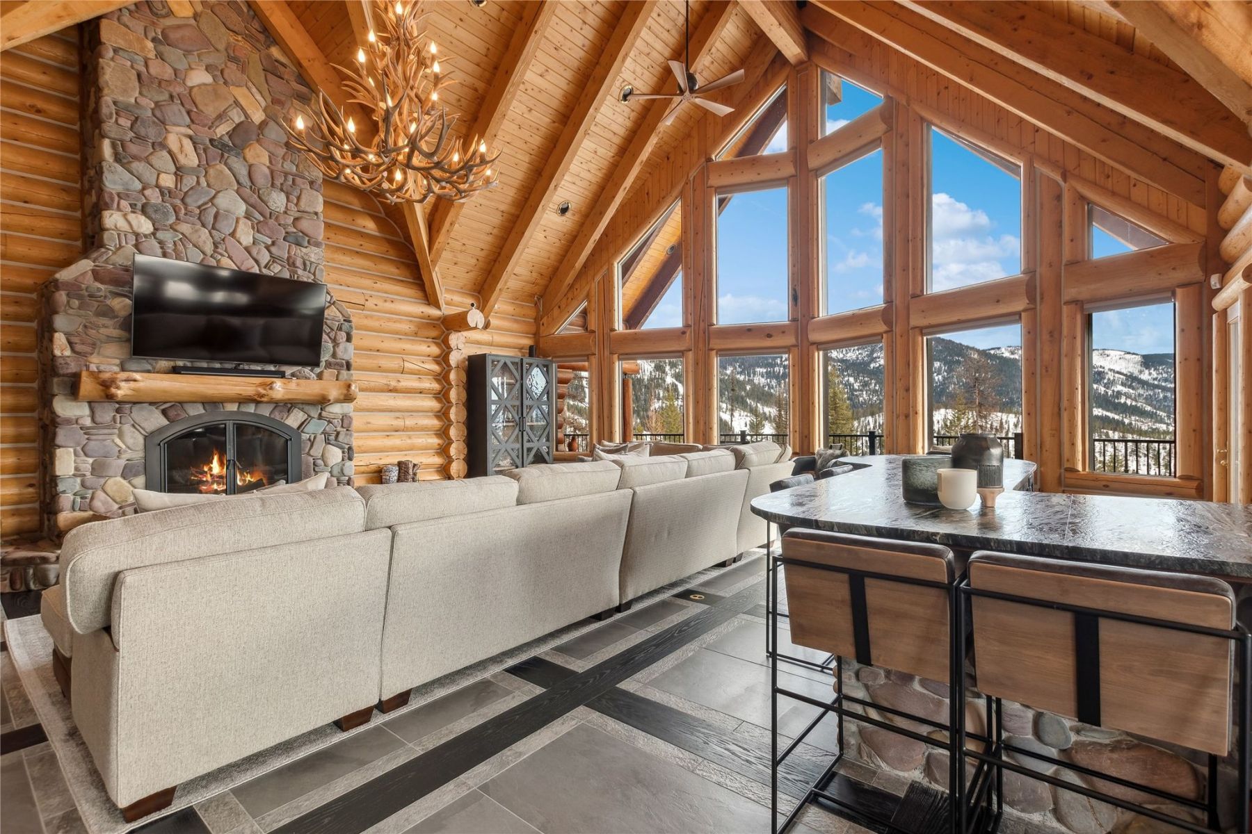 • Features: The property is adorned with three grand Montana-style stone fireplaces, adding warmth and charm to the interior. Recently updated throughout, the home features uniquely designed granite countertops, an expansive kitchen with an open great room, and a dedicated bar area ideal for entertaining guests.