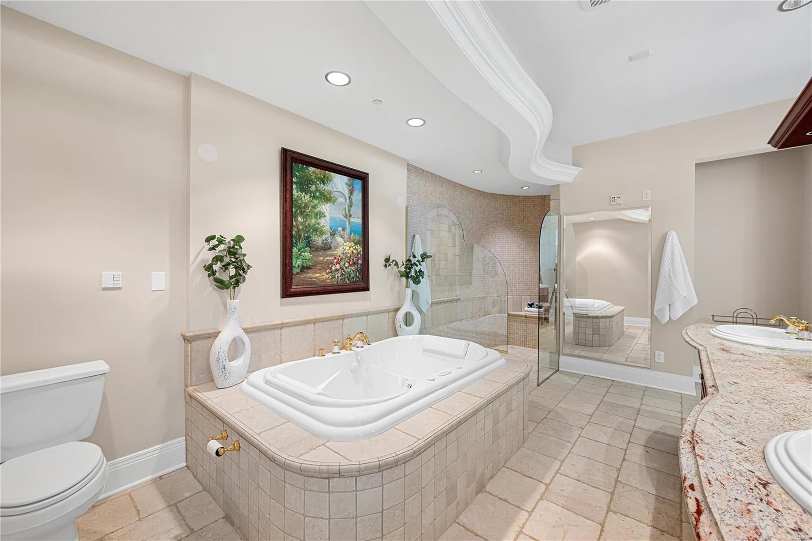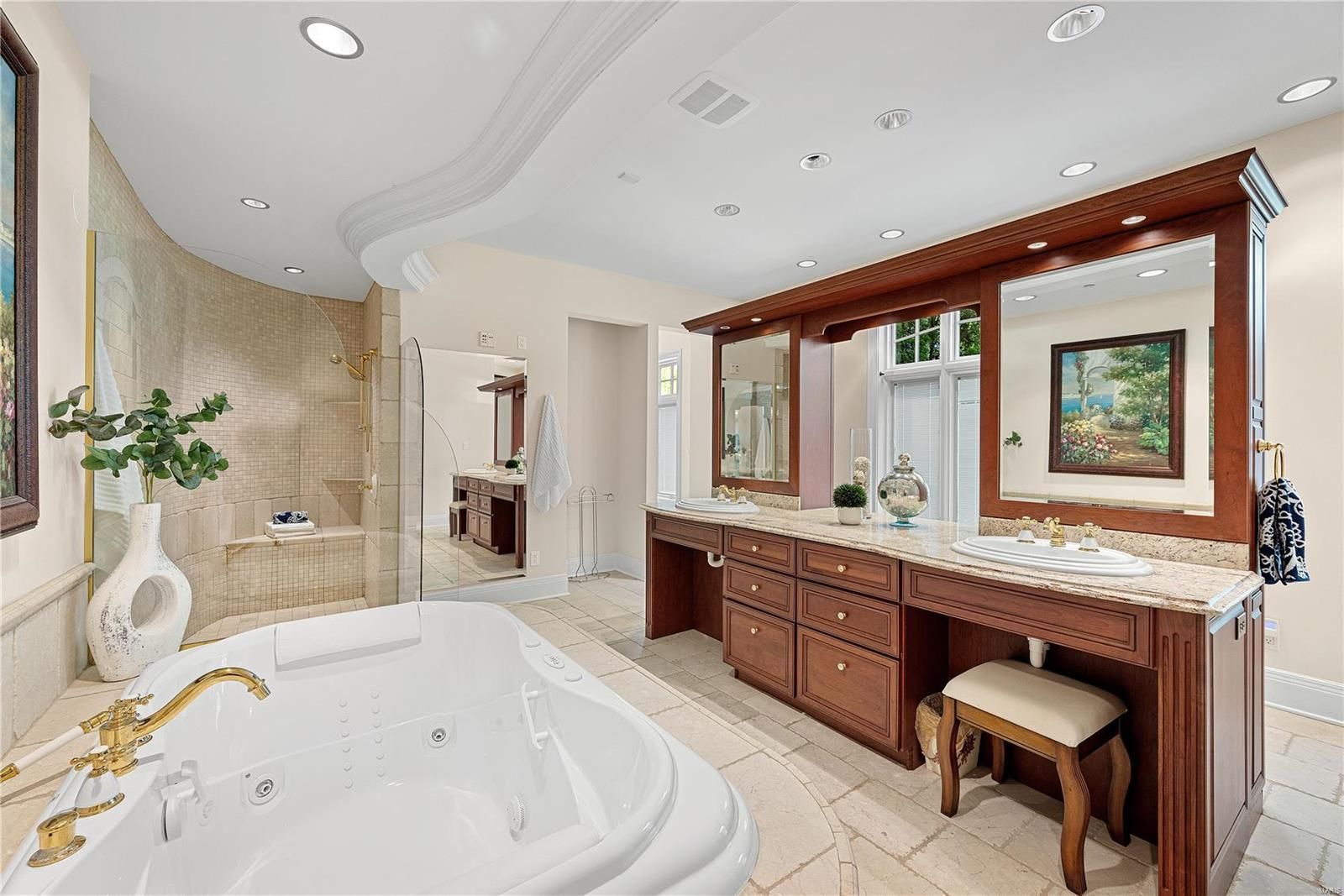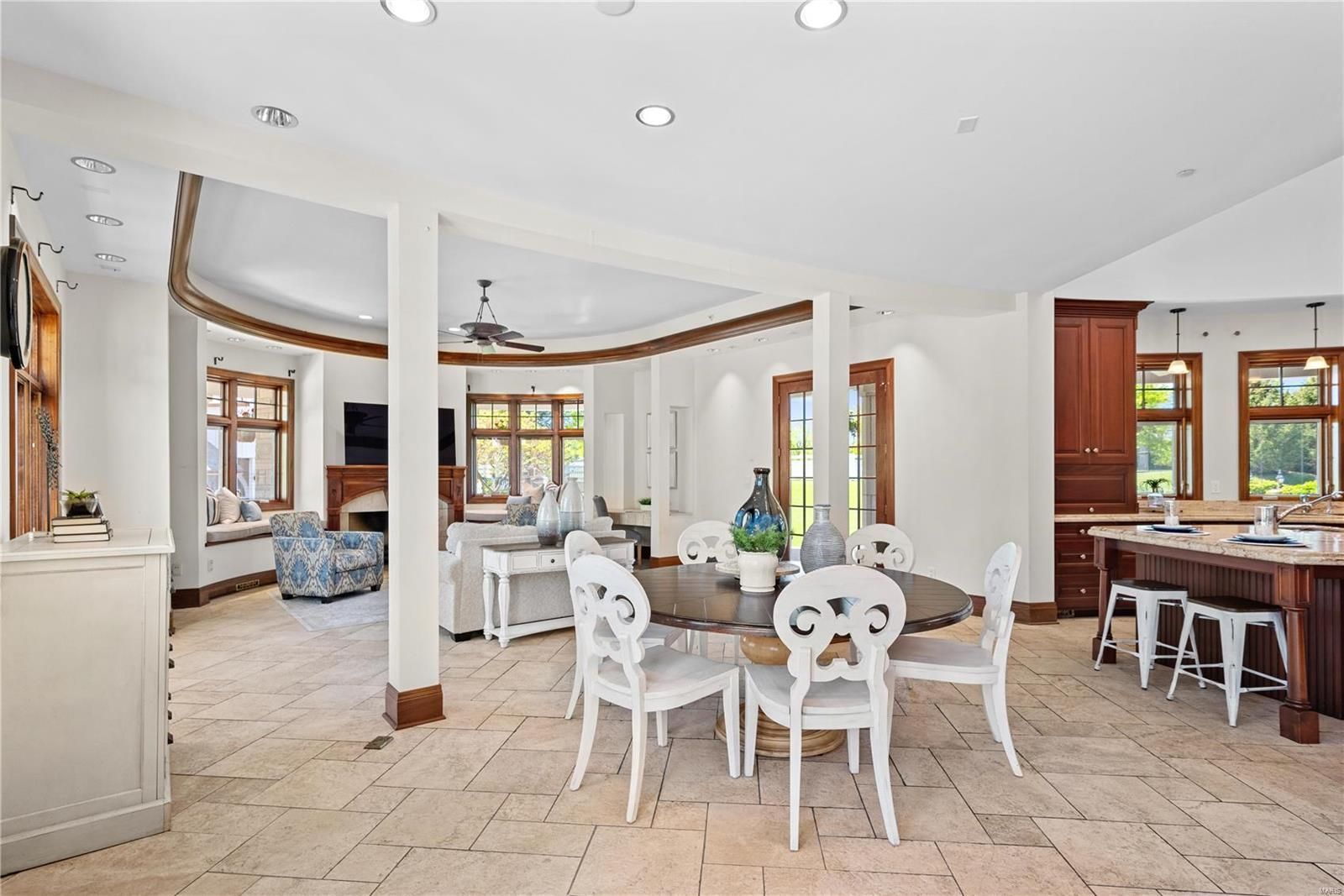 The outdoor area boasts a plethora of recreational amenities, including a resort-worthy pool with racing slides, a swim-up bar, a lazy river, waterfall-covered grotto, dive board, and zero-edge entry. Whether hosting events, enjoying family gatherings, or simply relaxing in the sun, this property offers endless opportunities for fun and relaxation.