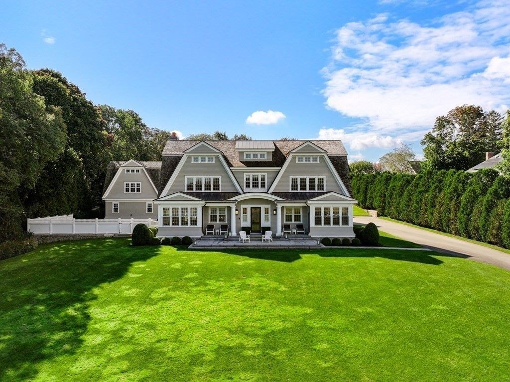 Estate Highlights: This newly constructed “Nantucket-like family compound” boasts 6 bedrooms with ensuite baths in the main house, complemented by a charming 2-bedroom, 2.5-bath guest house. The estate’s grandeur is matched by its extensive amenities, including an Australian Open surface tennis court, a heated 40 ft pool connected by a bluestone patio, and a private dock with mooring access to Duxbury Bay.