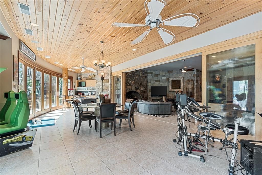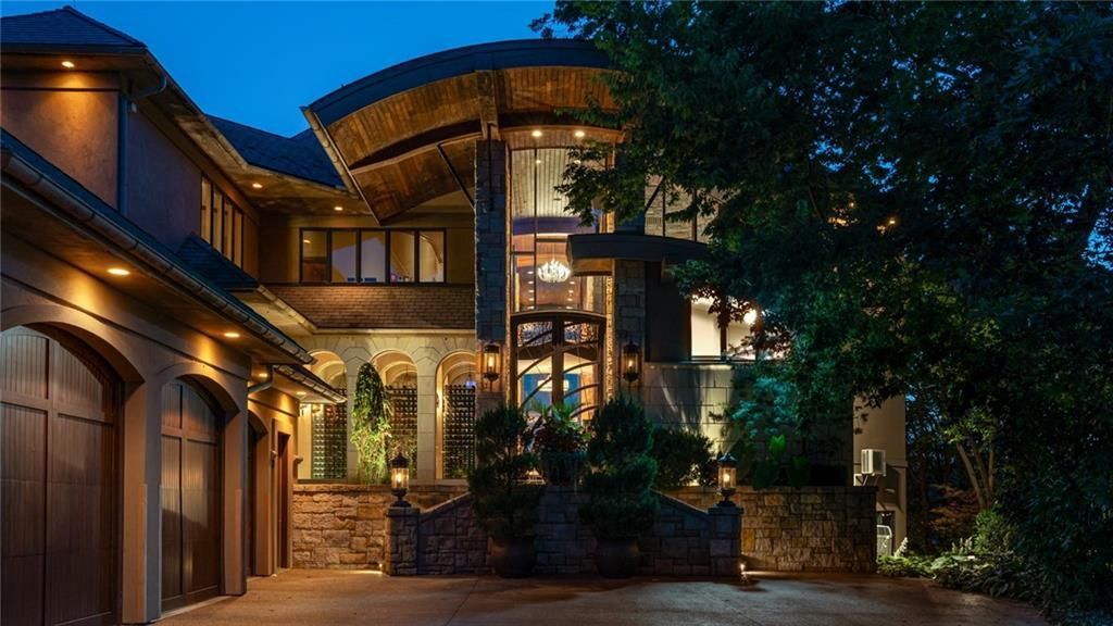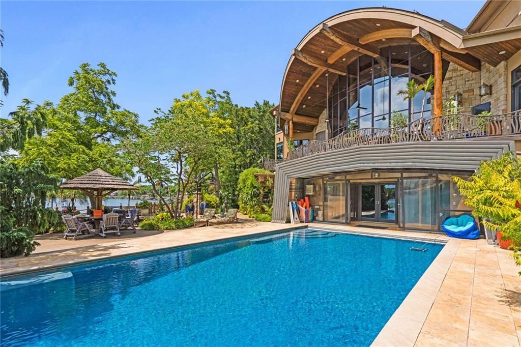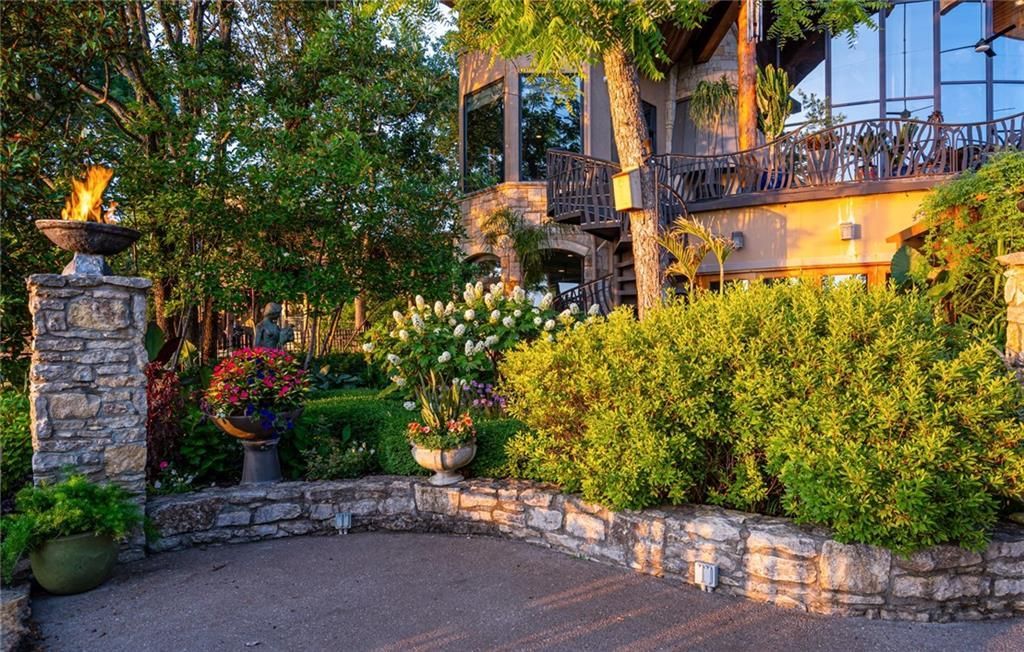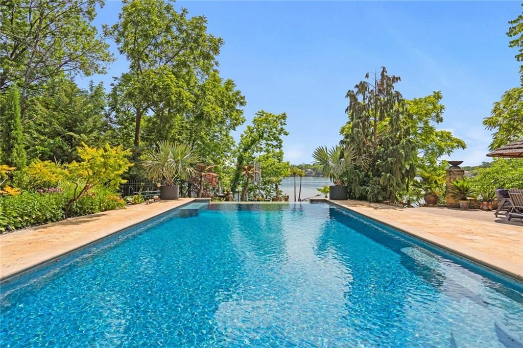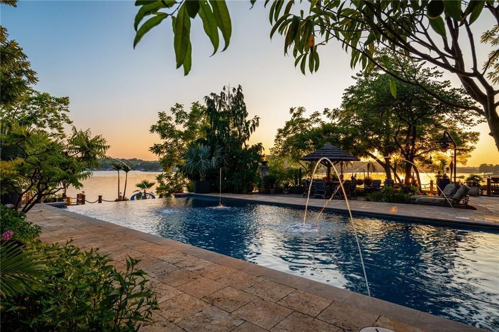 Step outside to enjoy al fresco dining on the deck with an outdoor kitchen, granite 22-person table, fireplace, and lake views. The infinity-edge pool, enclosed with a telescoping enclosure, allows for year-round enjoyment. Lush landscaping, gas torches, fountains, waterfalls, and integrated bug suppression system enhance the outdoor experience.
