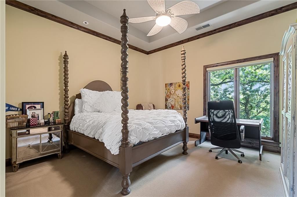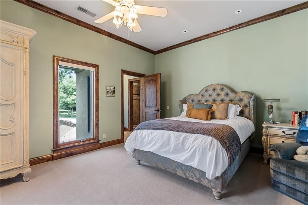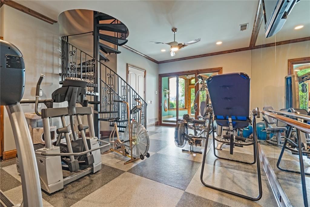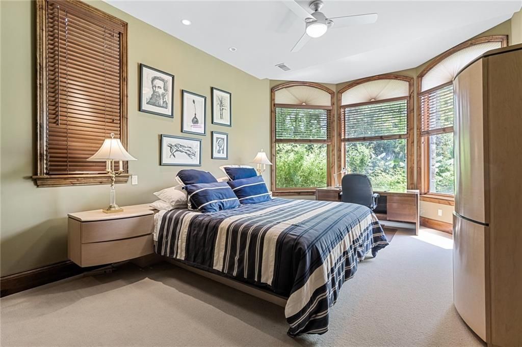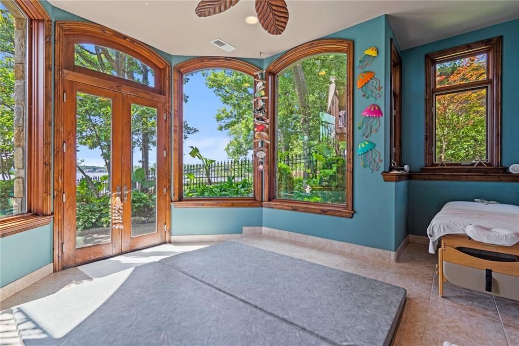 Step outside to enjoy al fresco dining on the deck with an outdoor kitchen, granite 22-person table, fireplace, and lake views. The infinity-edge pool, enclosed with a telescoping enclosure, allows for year-round enjoyment. Lush landscaping, gas torches, fountains, waterfalls, and integrated bug suppression system enhance the outdoor experience.