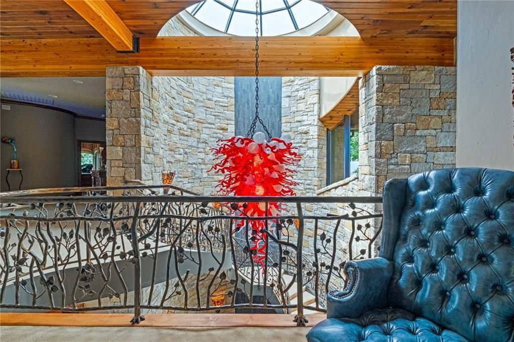 As you enter through custom front doors, you’re greeted by a museum-worthy 1,000 bottle wine room and a stunning glass dome-topped, free-floating 3-story spiral staircase. The grandeur continues with a remarkable 26-foot barrel wood ceiling that extends throughout the home, complemented by a breathtaking 900-gallon living reef saltwater aquarium.