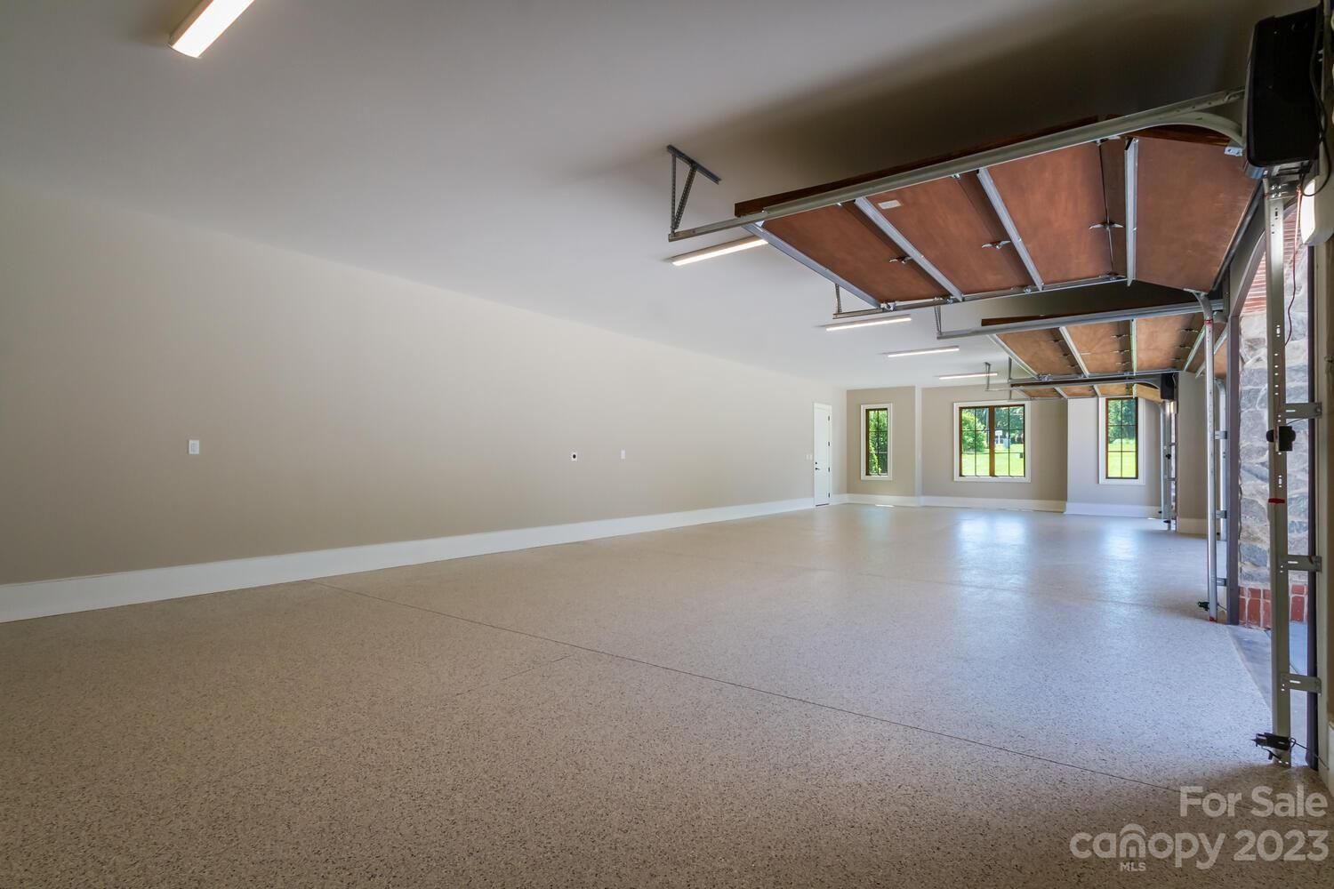 The property offers an oversized 4-car garage with capacity for 5+ cars, featuring high ceilings that can accommodate lifts and side openers on all doors.