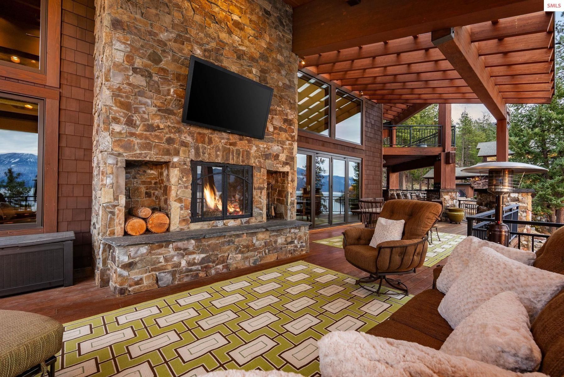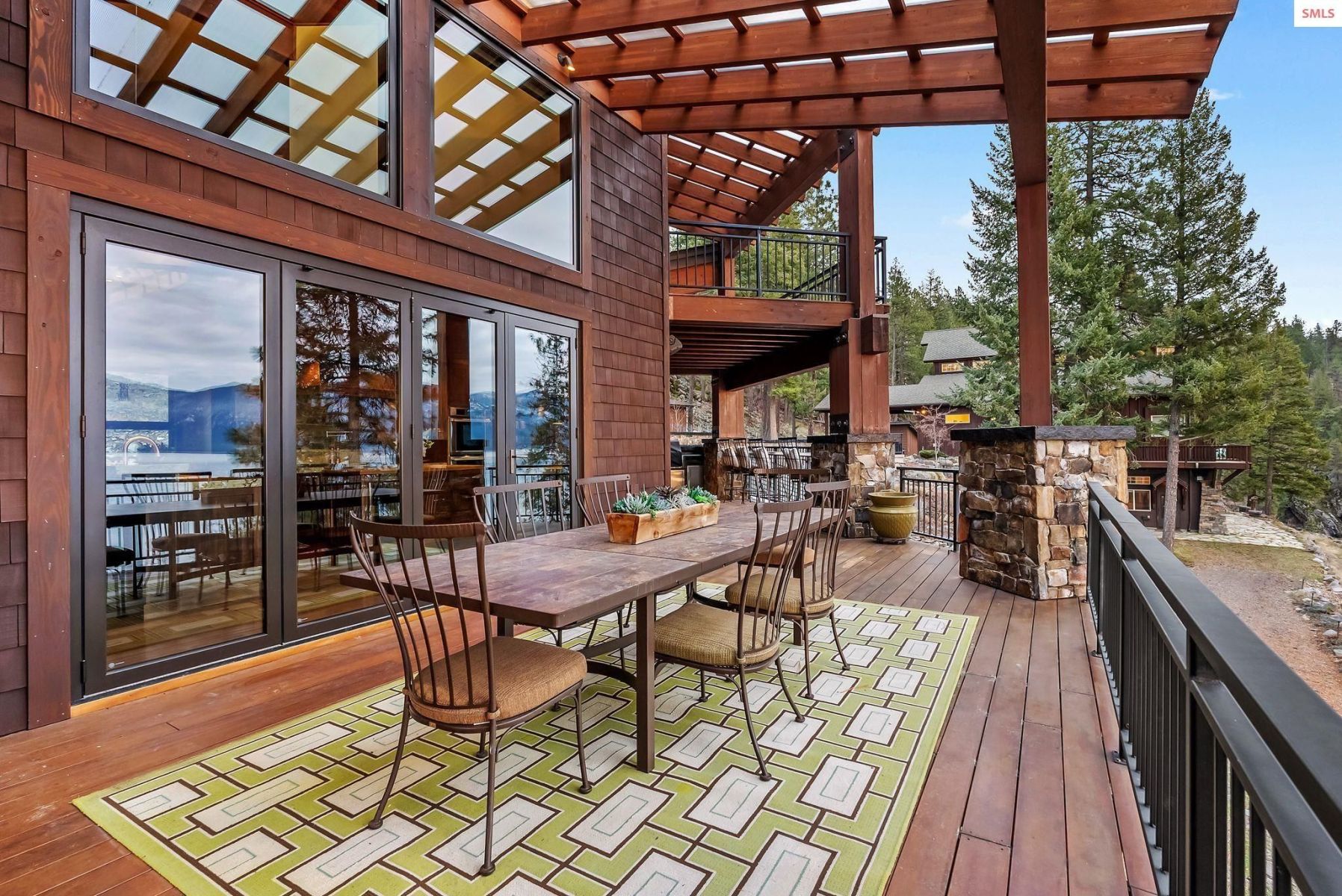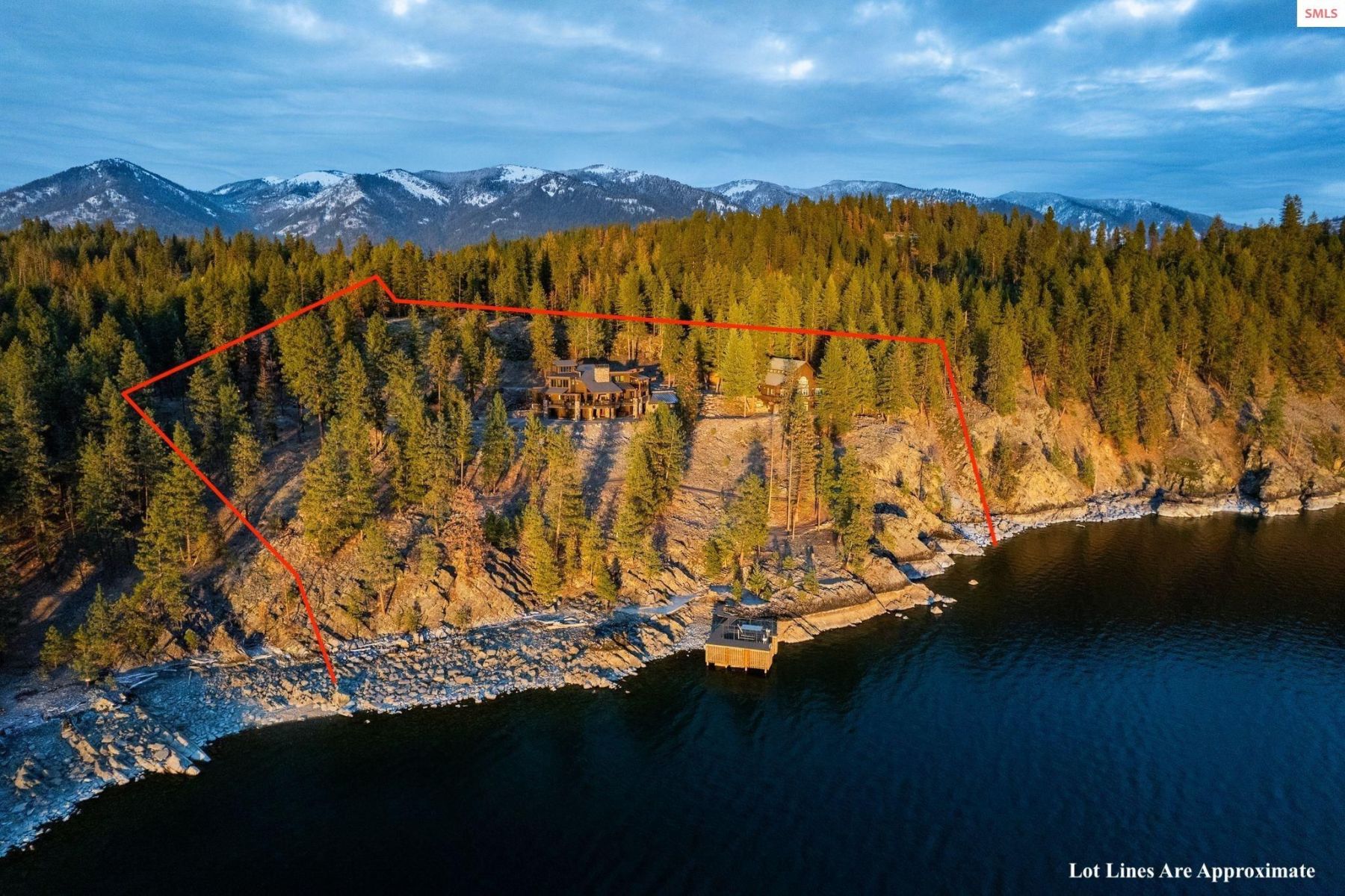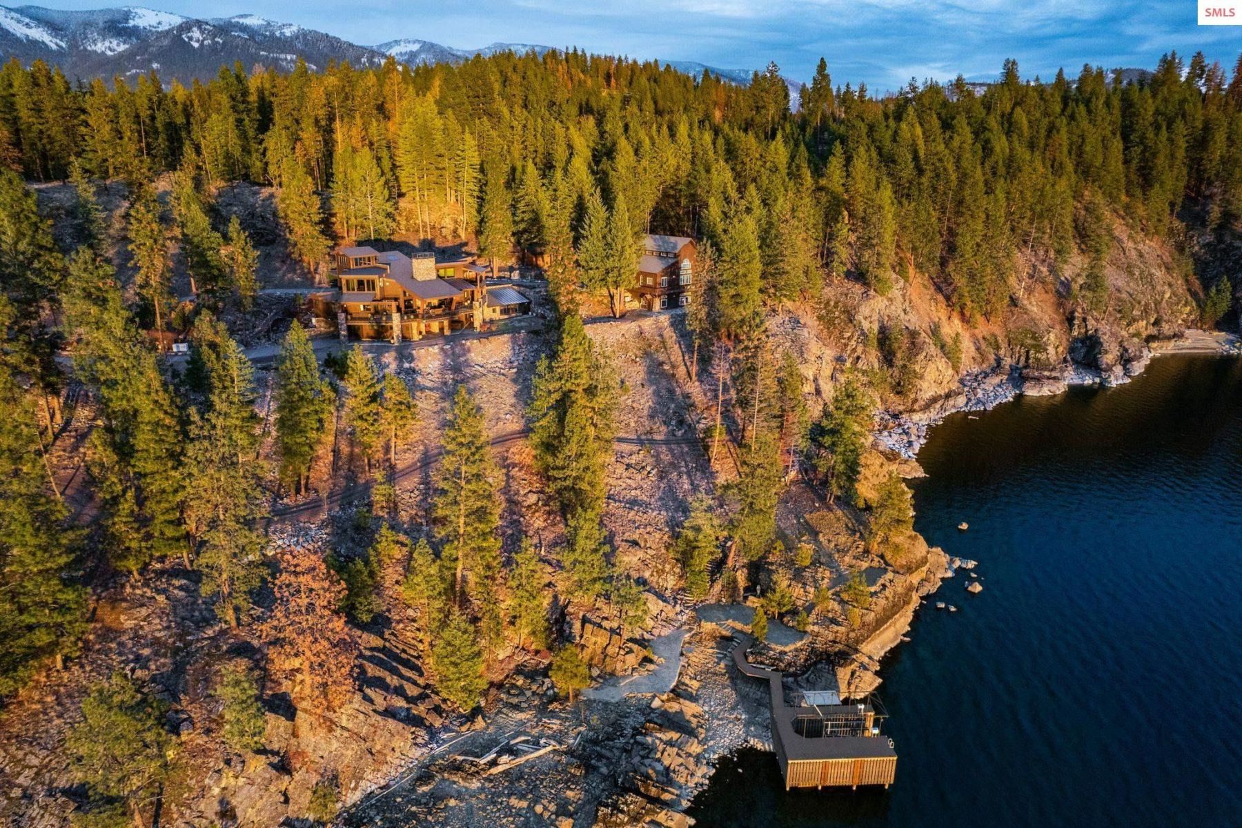 - Private Waterfront: The property boasts 400 feet of private waterfront on Lake Pend Oreille, offering privileged access to the pristine waters. A private dock with a boat lift and a stacked stone retaining wall leading to a waterfront terrace and outdoor shower enhance the waterfront experience.