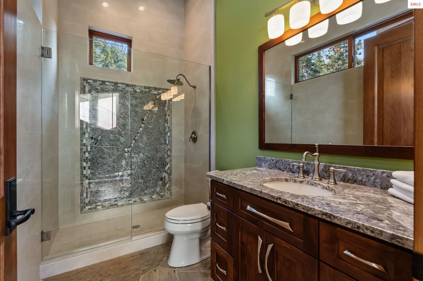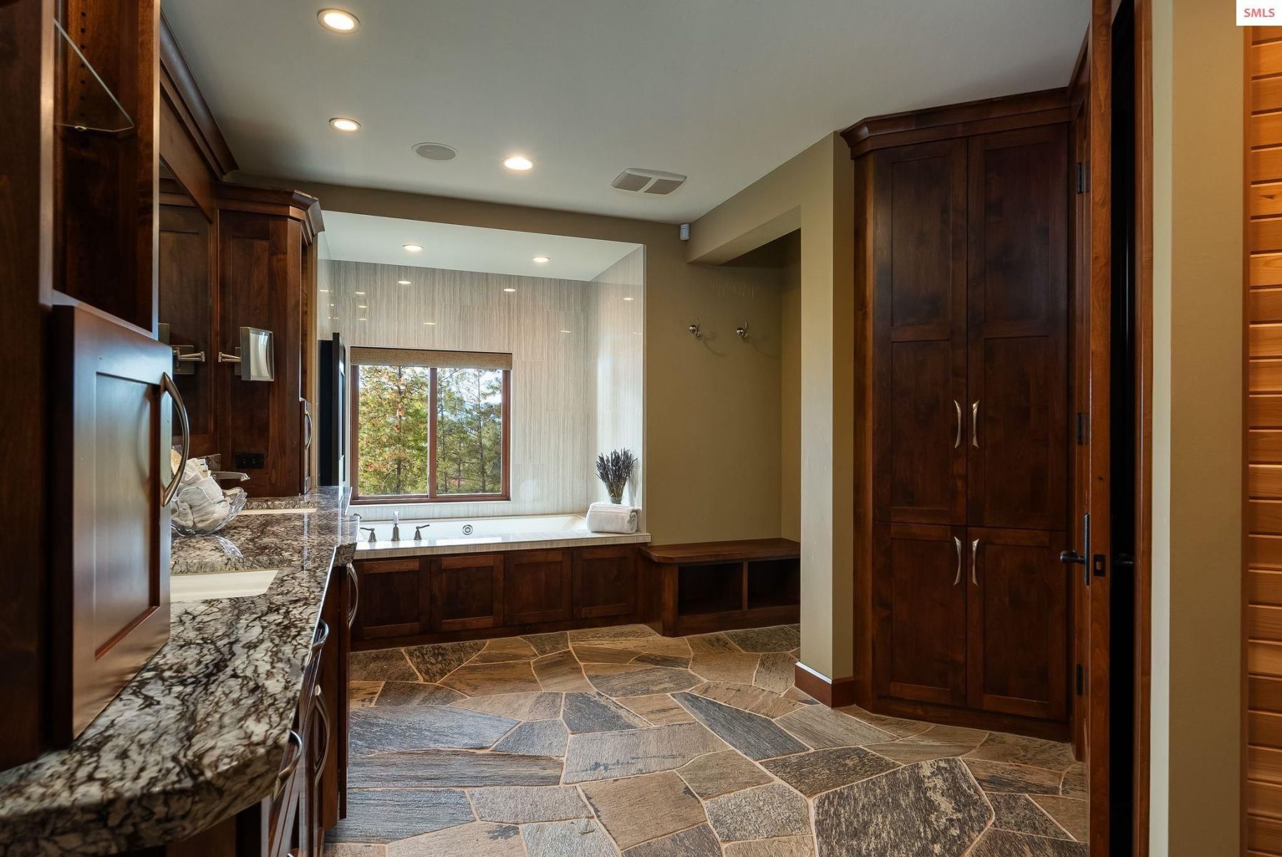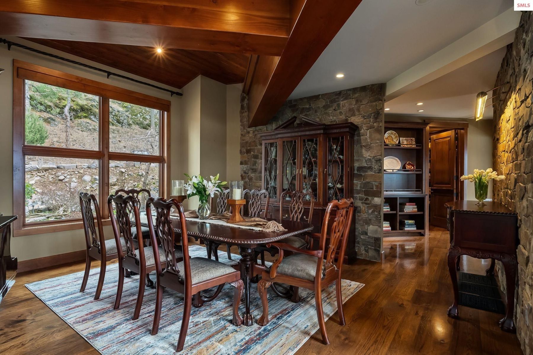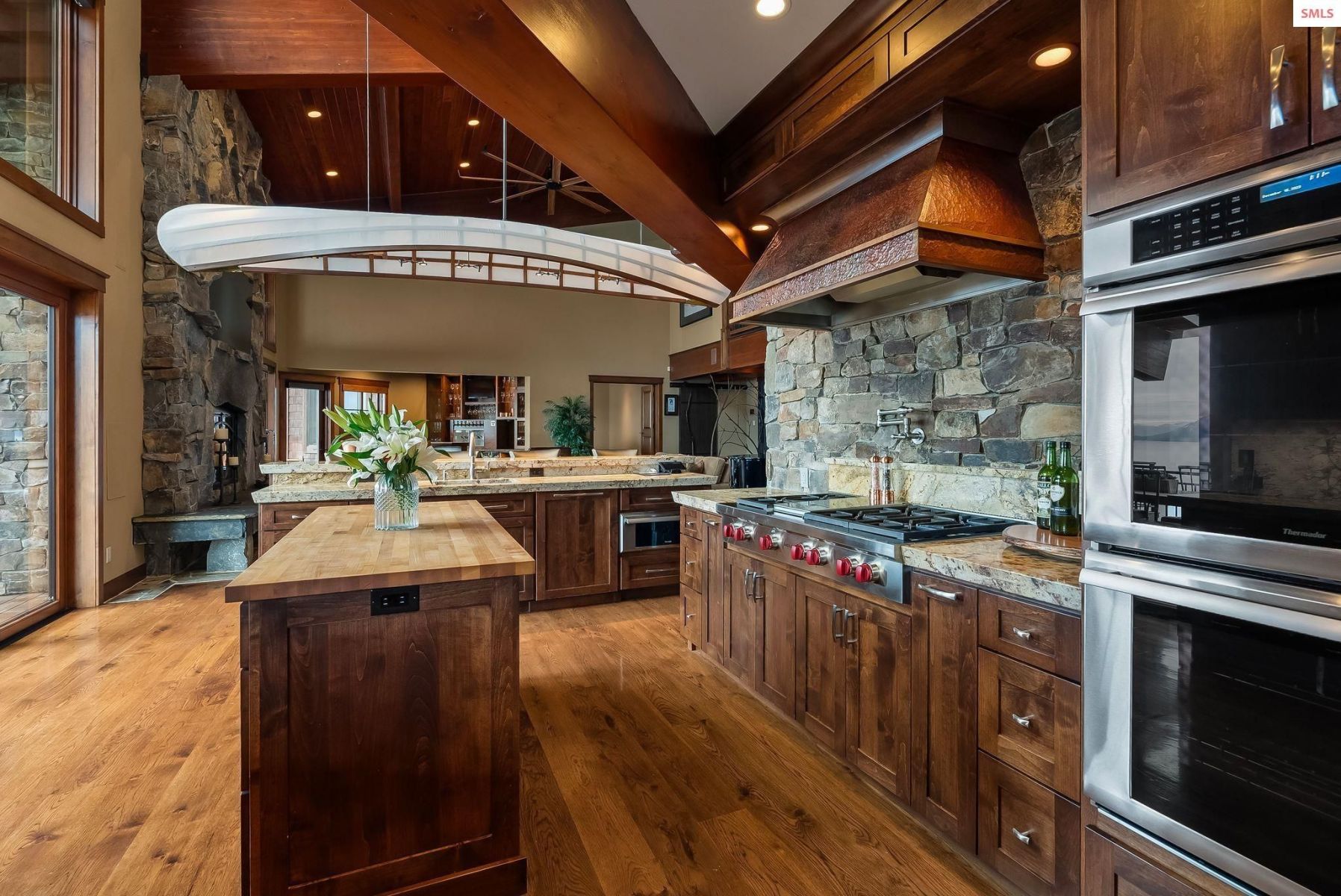 - Private Waterfront: The property boasts 400 feet of private waterfront on Lake Pend Oreille, offering privileged access to the pristine waters. A private dock with a boat lift and a stacked stone retaining wall leading to a waterfront terrace and outdoor shower enhance the waterfront experience.