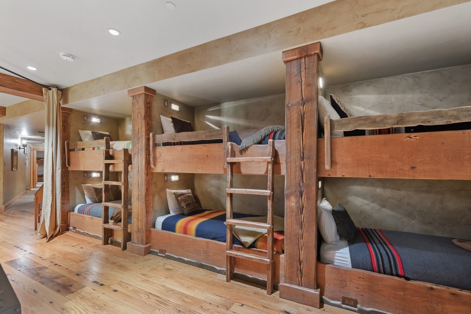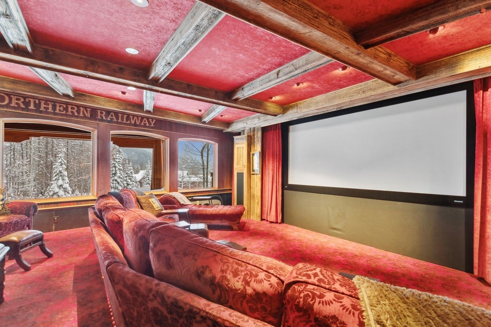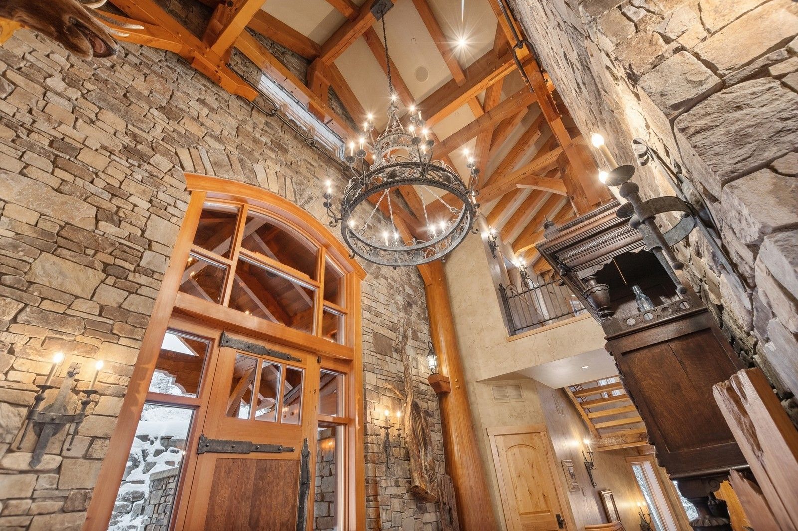 Designed to harmonize with its natural surroundings, the Northern Lights Lodge features massive windows, stunning ironwork, cedar beam supports, chestnut flooring, and bespoke cabinetry, all crafted from reclaimed barn wood sourced from Ravalli, Montana. Radiant heat floors, remote-controlled blinds, 8 dishwashers, and several laundry rooms seamlessly blend opulent indulgence with the essence of outdoor adventure.