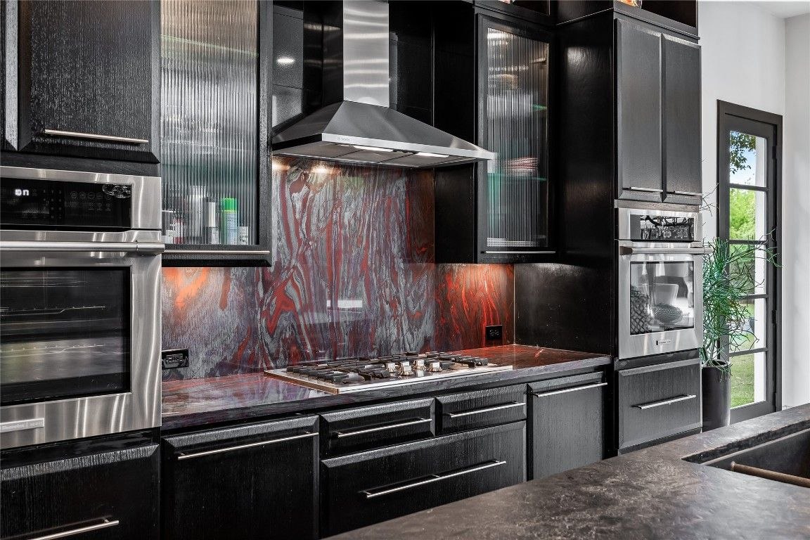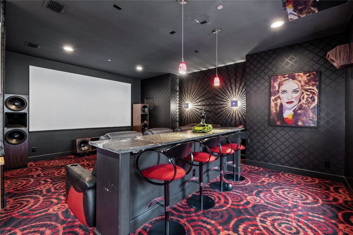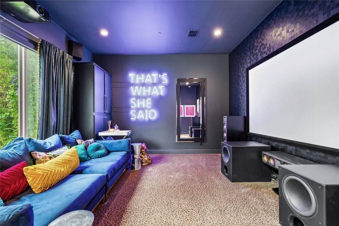 Outside, the backyard oasis beckons with a covered patio, sparkling pool, and custom-built cabana, offering the perfect setting for outdoor relaxation and entertainment. Additional highlights include a stunning theater with a 150-inch screen, a private gym, a custom den, and a four-car garage.