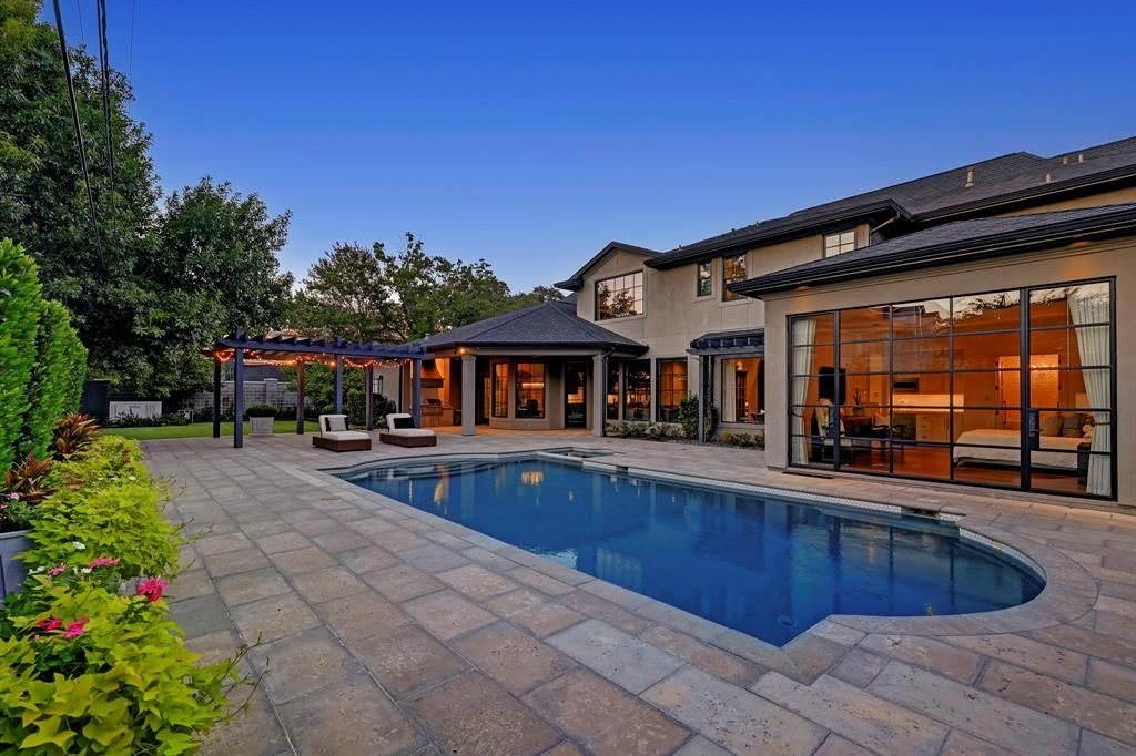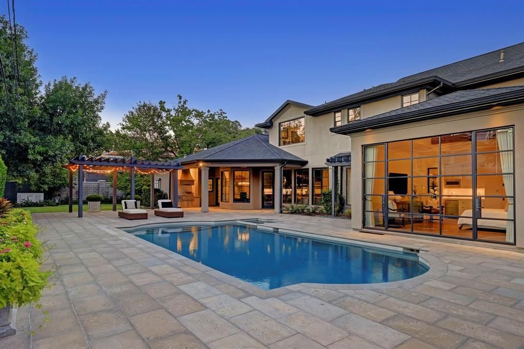• The expansive exterior grounds feature a resort-style swimming pool and spa, a large lush yard, a pergola, and a loggia with an outdoor kitchen, creating an outdoor paradise for relaxation and entertainment.