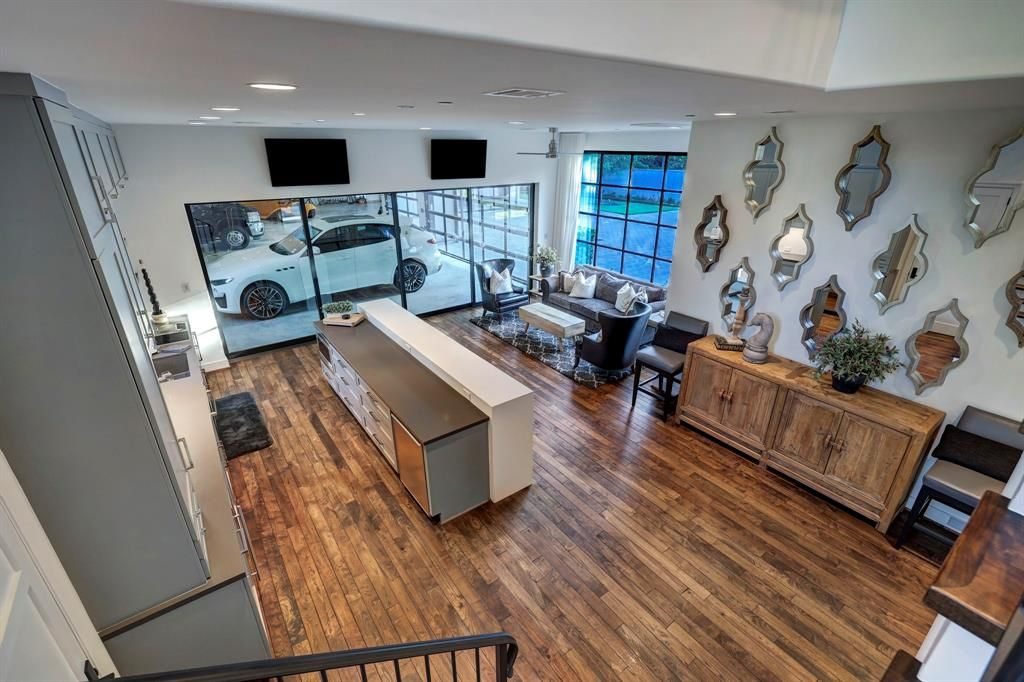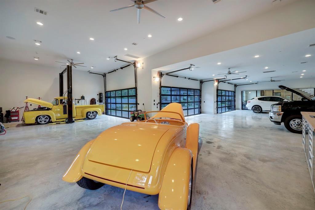• A motorized gate leads to a 10-car garage equipped with a hydraulic lift, air compressors, and a car wash station, providing ample space for car enthusiasts.