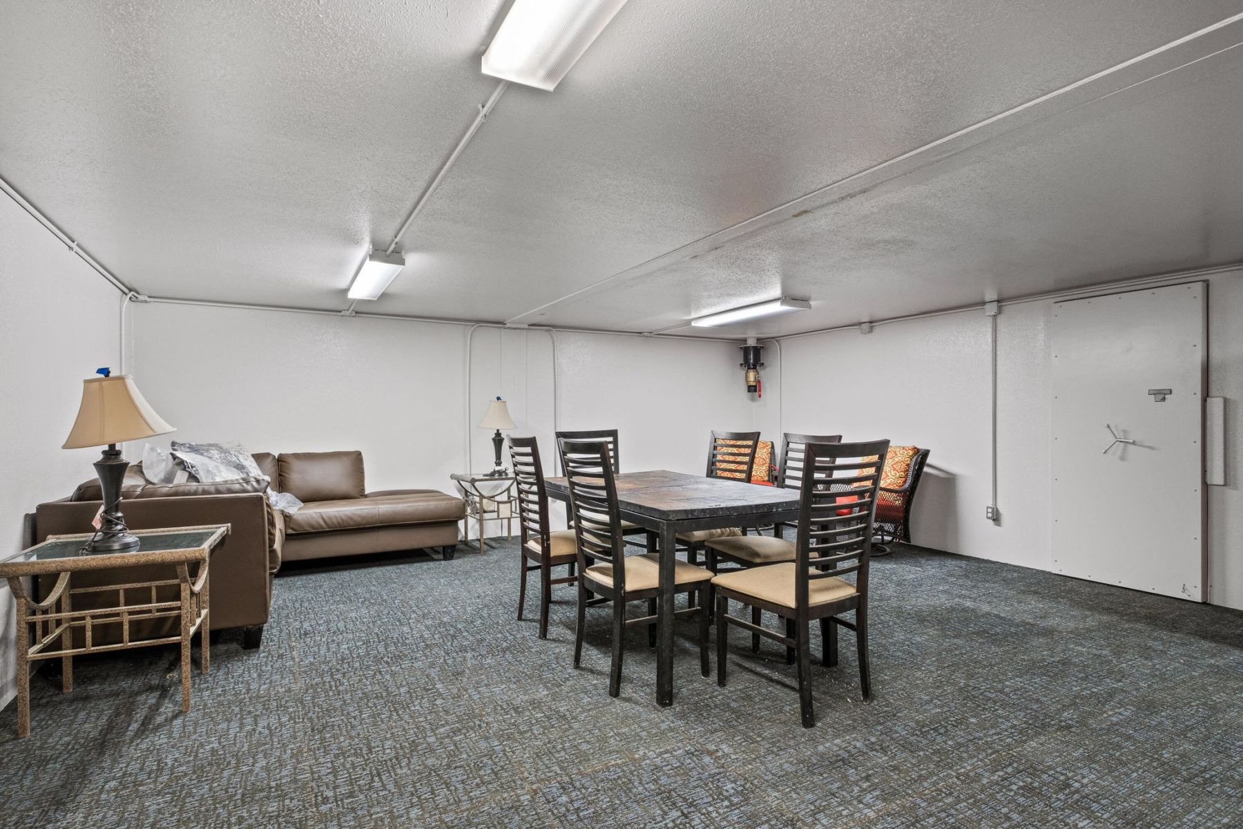 - A separate office with a custom wooden double door entryway provides a serene space for work.